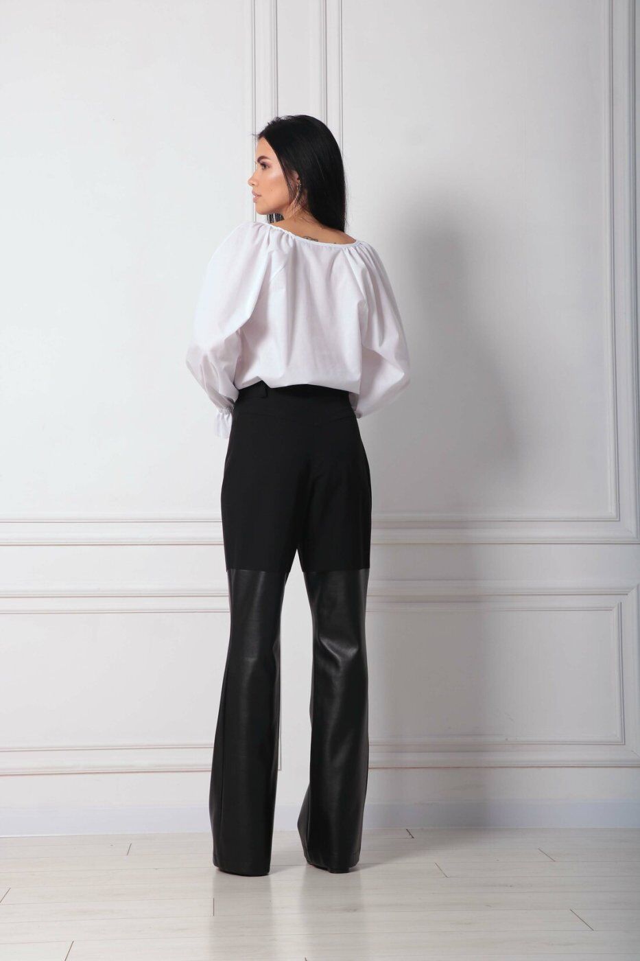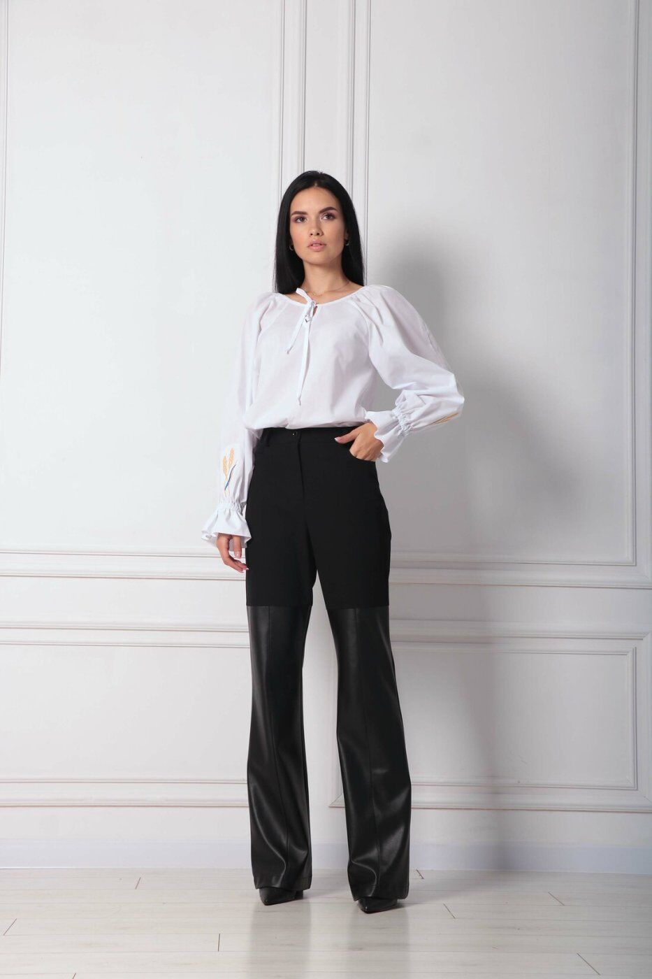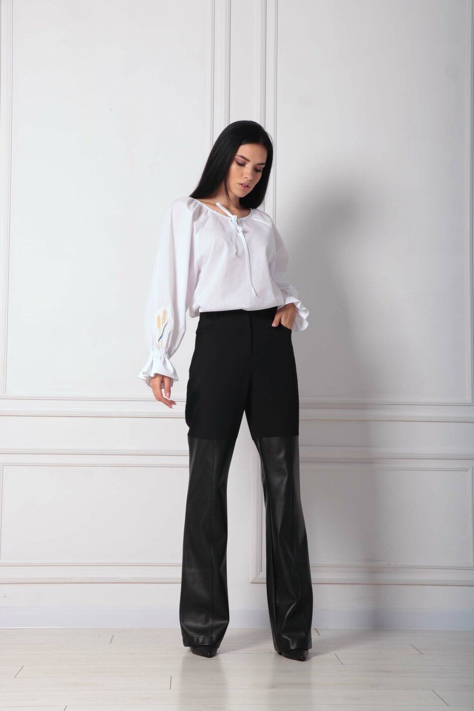Та оригінальні прямі брюки зі стриманим кльошем - вільно сідають по фігурі, підкреслюють всі переваги та подовжують силует. Мають горизонтальні шви вище коліна, нижня частина виповнена з оздоблювальної тканини.