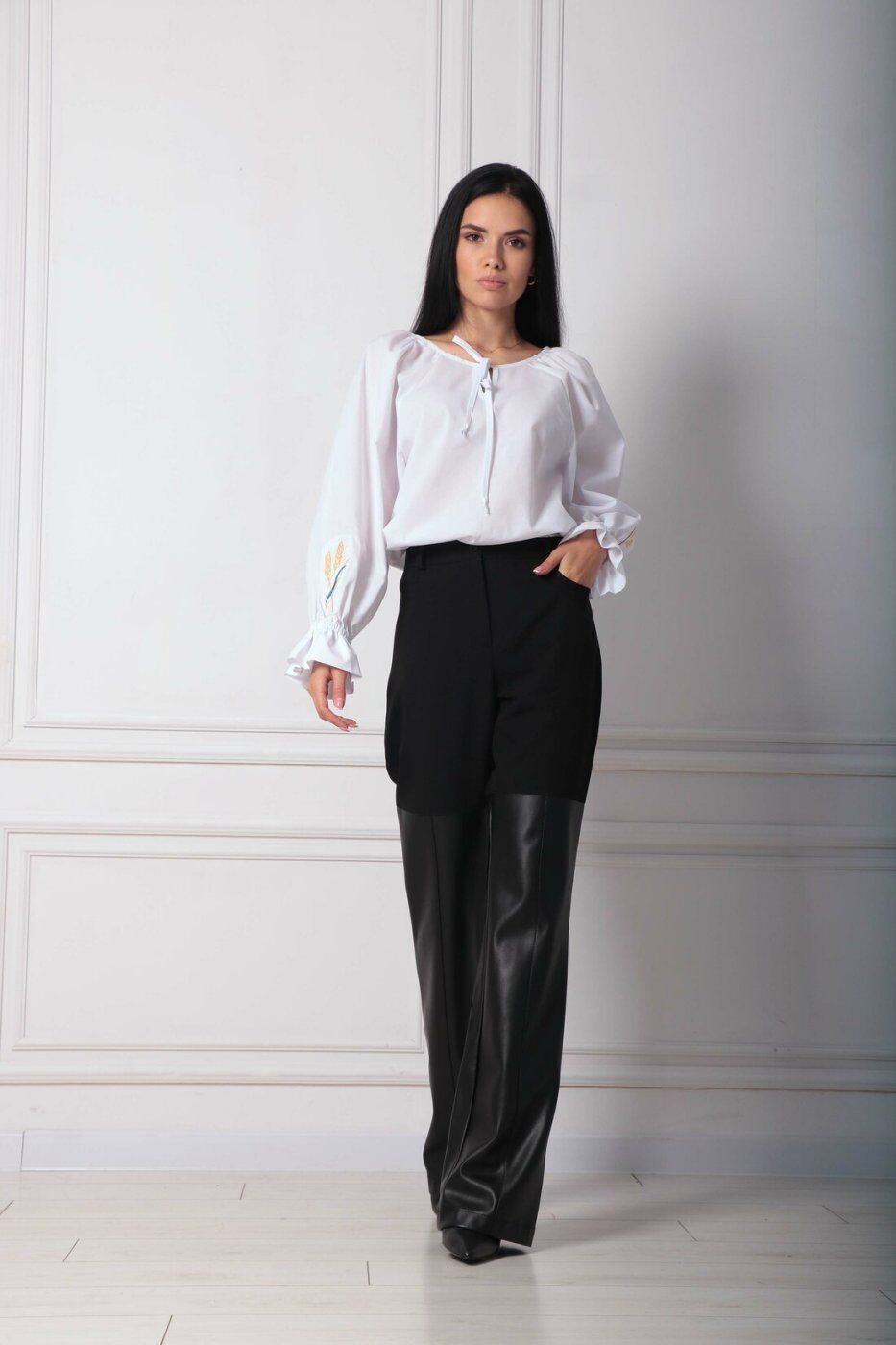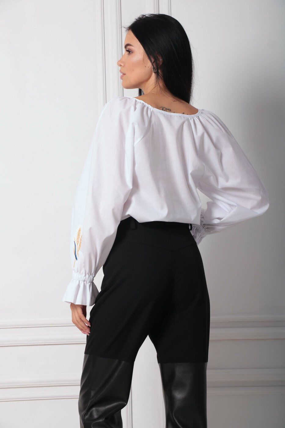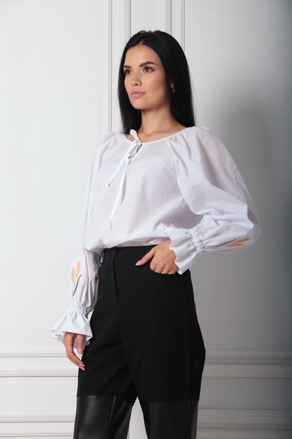Свободну блузу прямого силуету з легкими етно-нотками. Широка горизонтальна горловина по переду має зав ' язки. Пишний рукав-реглан по низу зібраний на резинку, утворюючи рюшу.