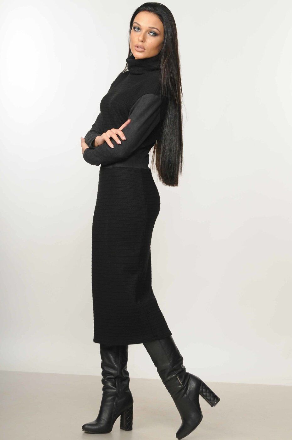 Стильна та універсальна сукня прилеглого силуету міді-довжини з оригінальною широкою вставкою із замші по лінії талії. Лінія плеча подовжена, рукав виконаний із замші.