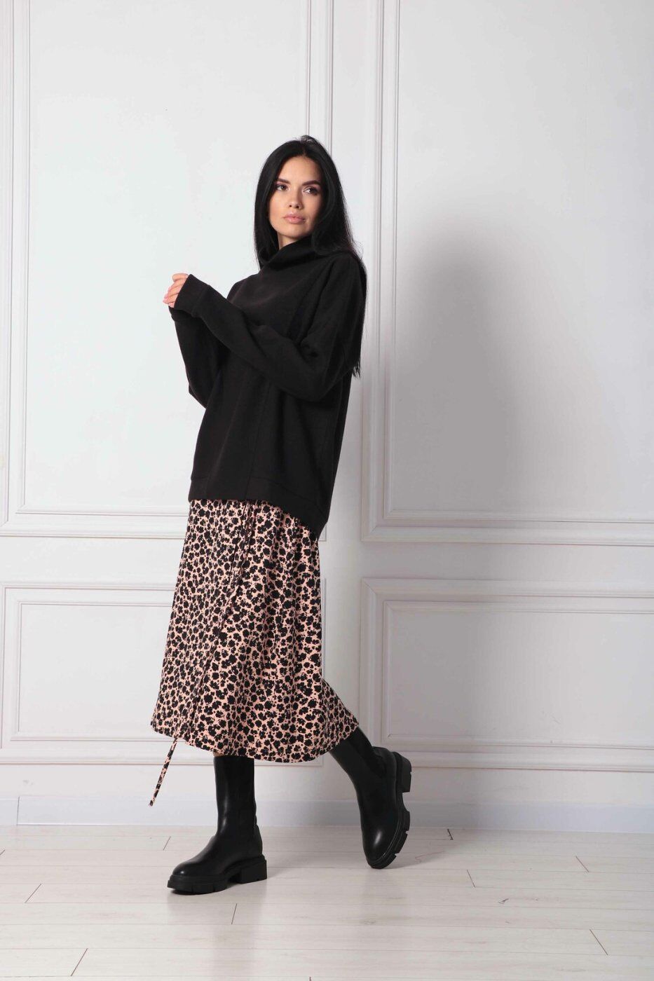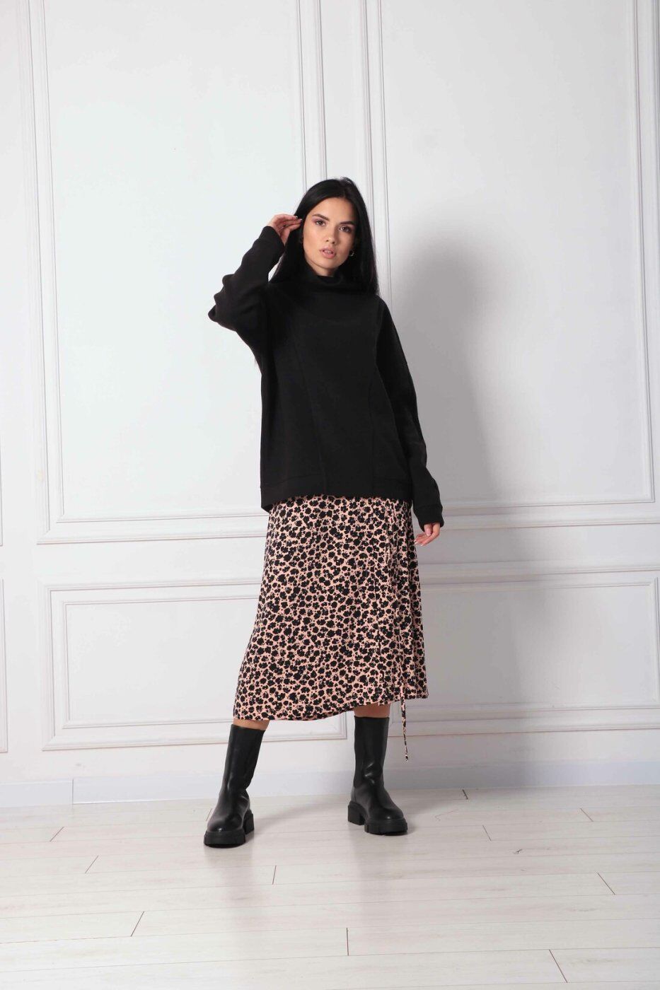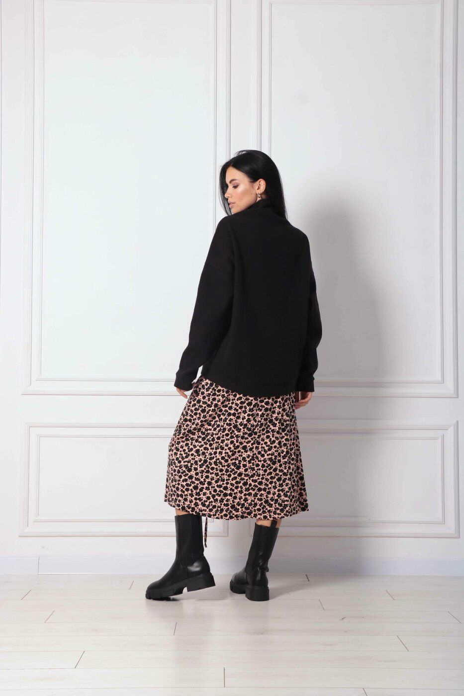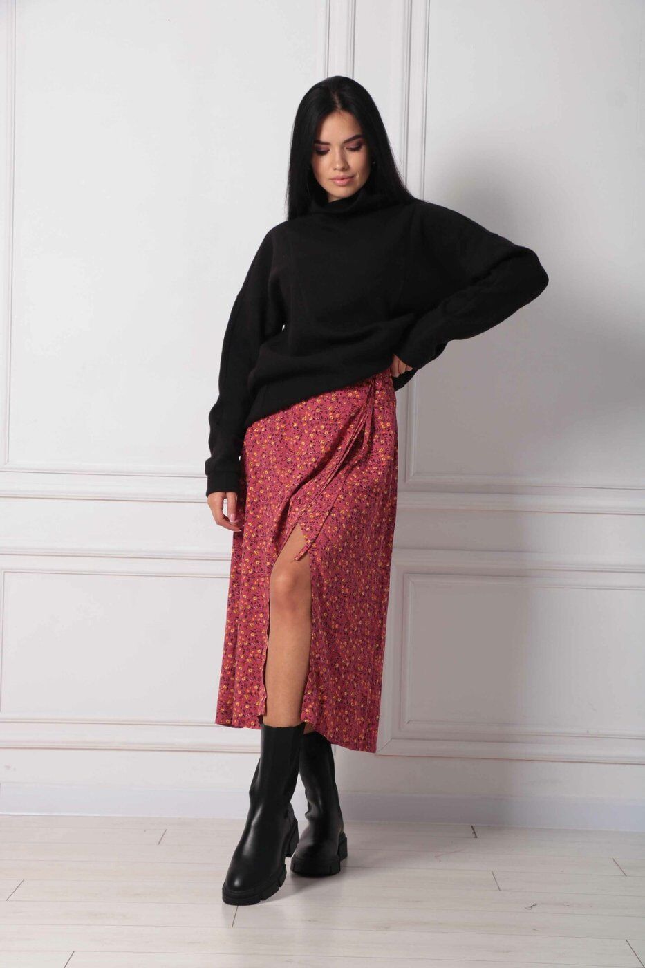 Романтична спідниця міді довжини прилеглого силуету. По переду запах, що вшито у широкий пояс зі шльовками,через які проходить тоненький пасок із тканини сідниці. На спинці застібка на ґудзик та потаємну блискавку, яка переходить у середній шов.