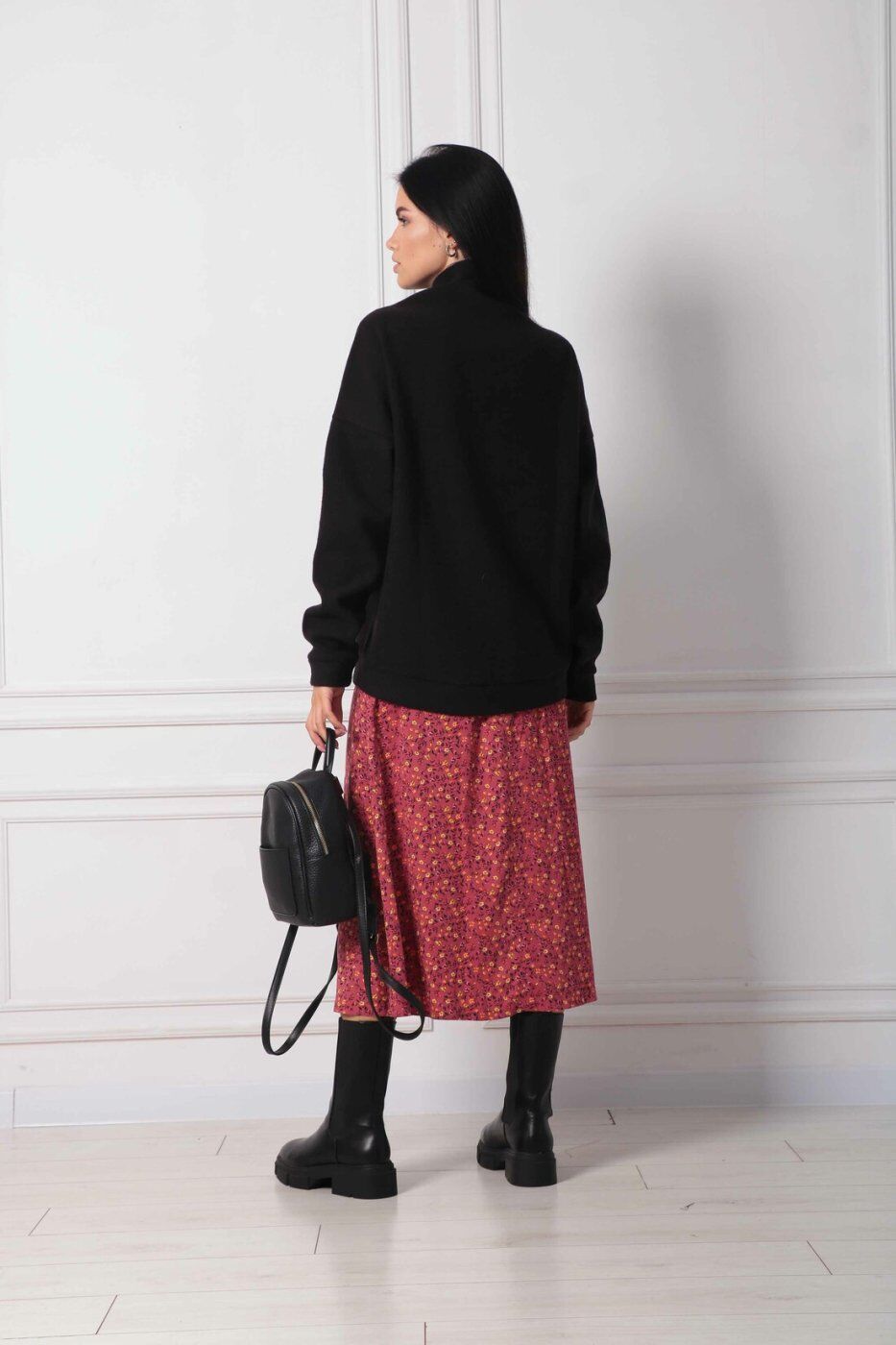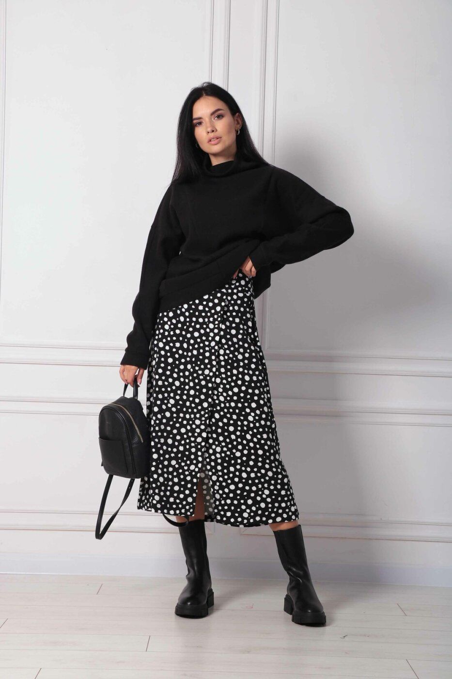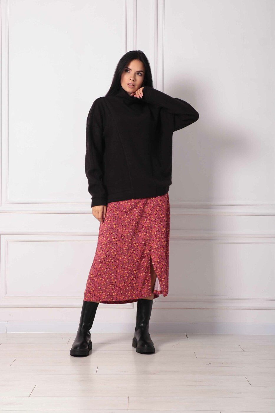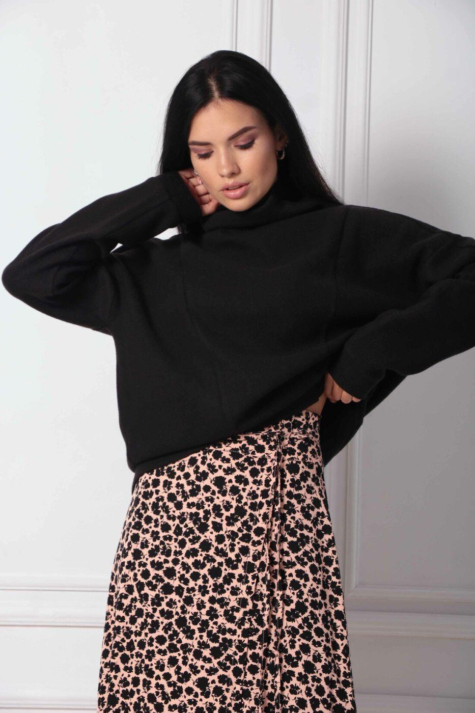 Романтична спідниця міді довжини прилеглого силуету. По переду запах, що вшито у широкий пояс зі шльовками,через які проходить тоненький пасок із тканини сідниці. На спинці застібка на ґудзик та потаємну блискавку, яка переходить у середній шов.