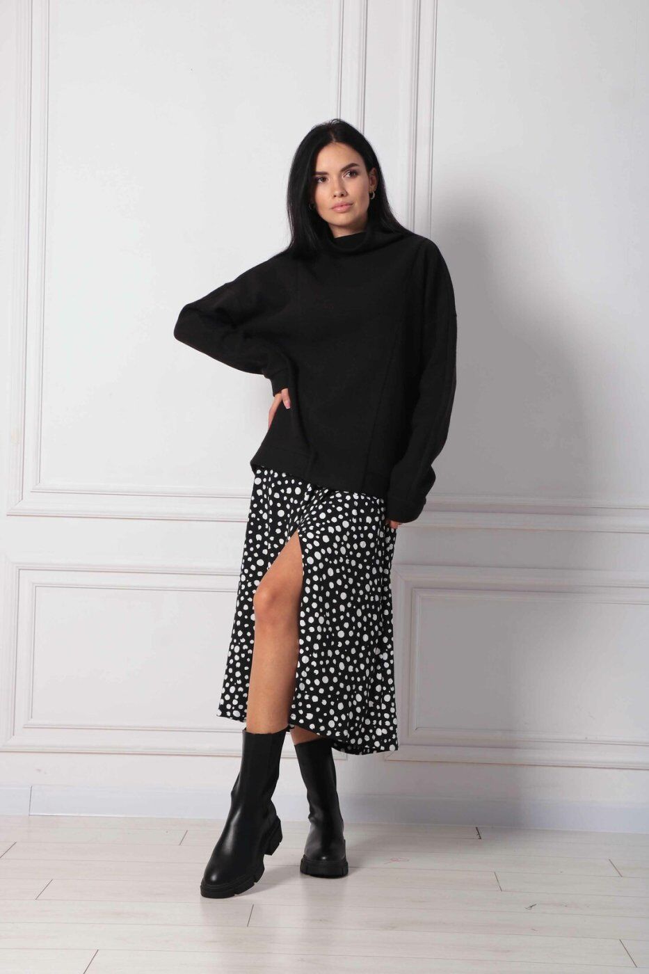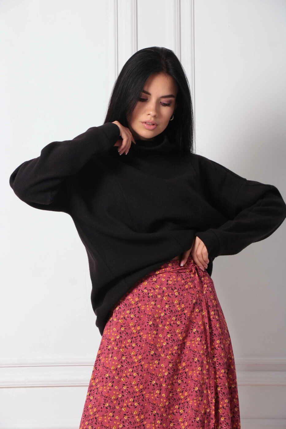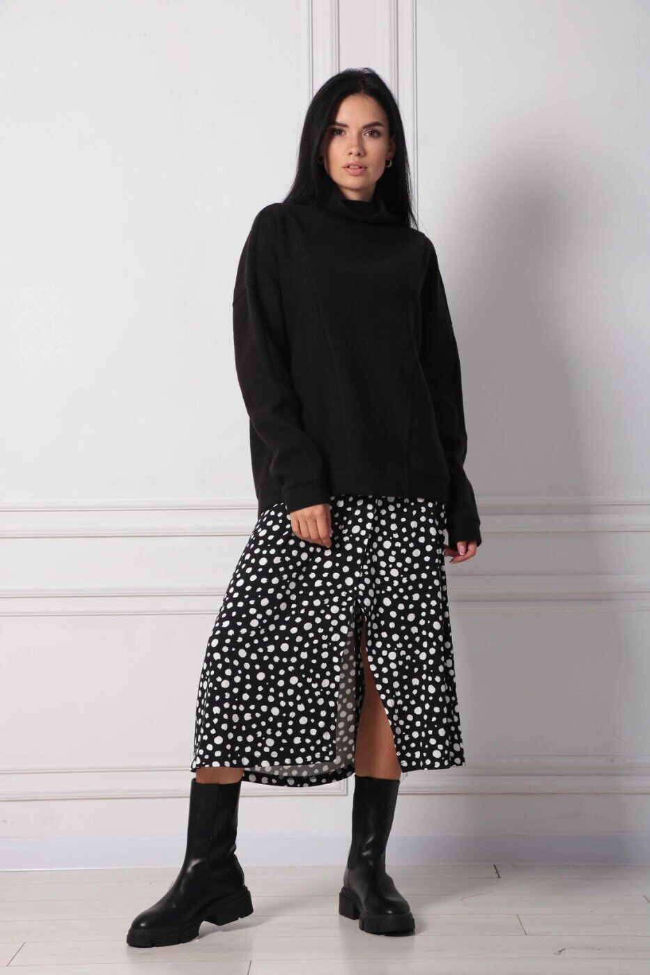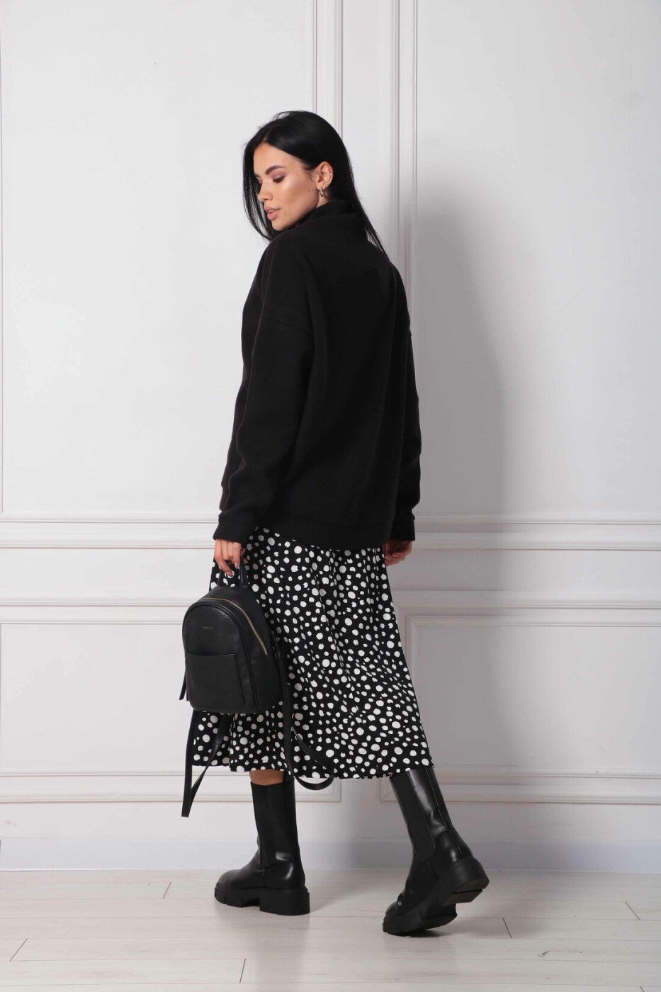 Романтична спідниця міді довжини прилеглого силуету. По переду запах, що вшито у широкий пояс зі шльовками,через які проходить тоненький пасок із тканини сідниці. На спинці застібка на ґудзик та потаємну блискавку, яка переходить у середній шов.