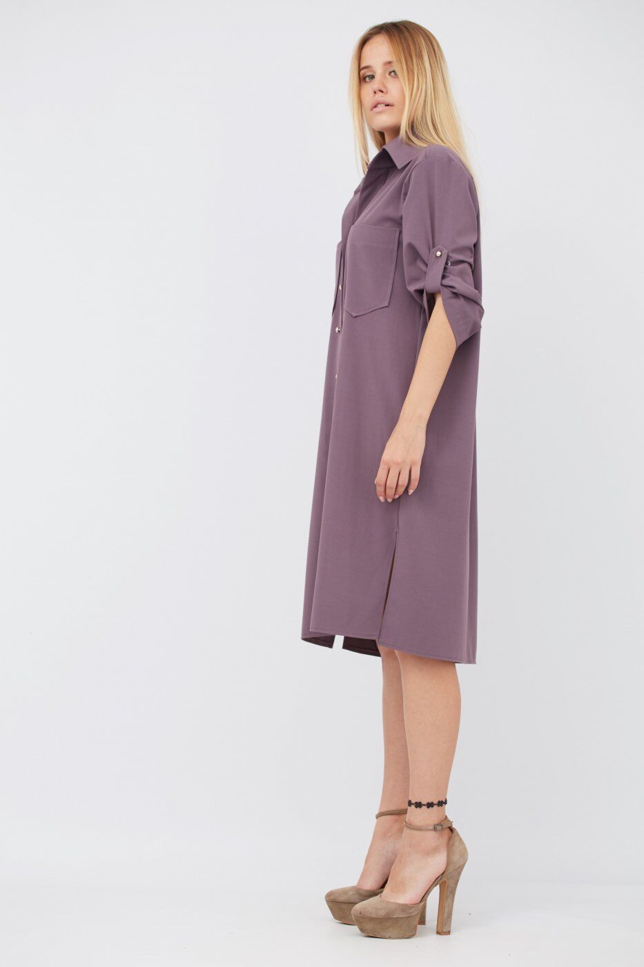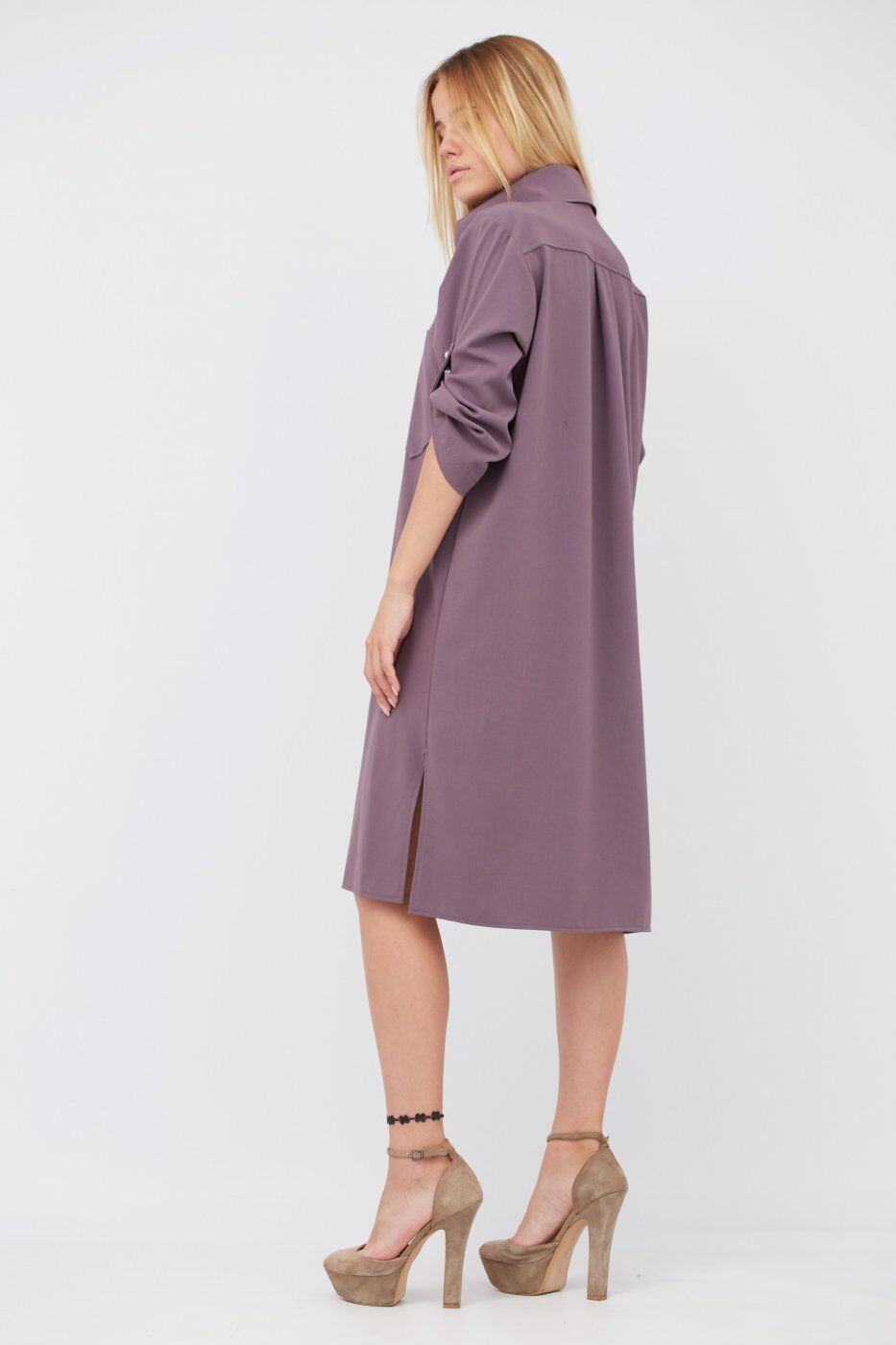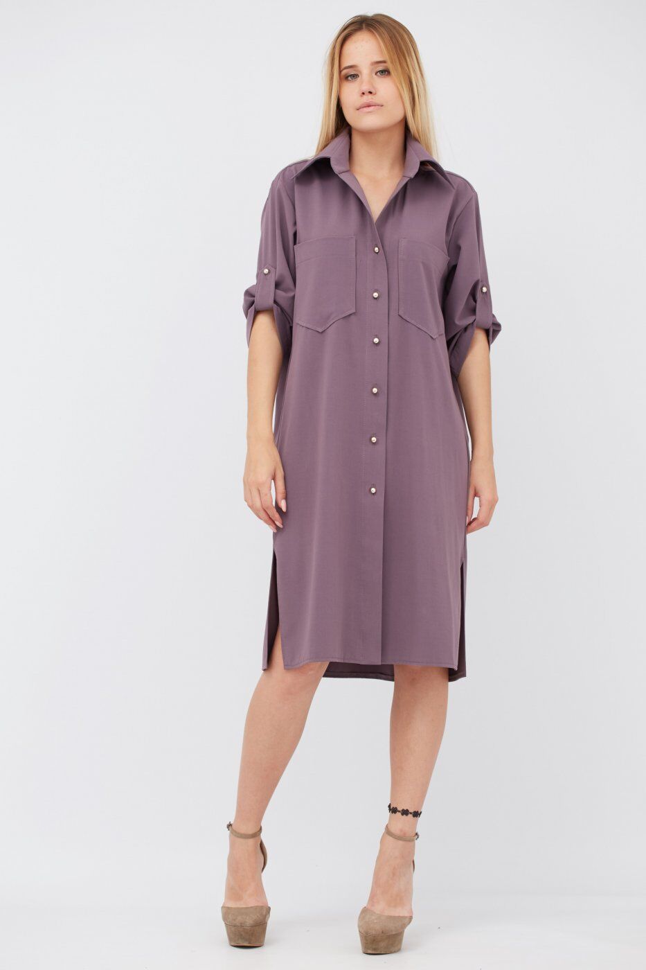 Платье свободного покроя "рубашка", из высококачественной костюмной ткани. Застежка спереди на пуговицы. Рукав 3/4 на патах. Спереди нагрудные карманы.