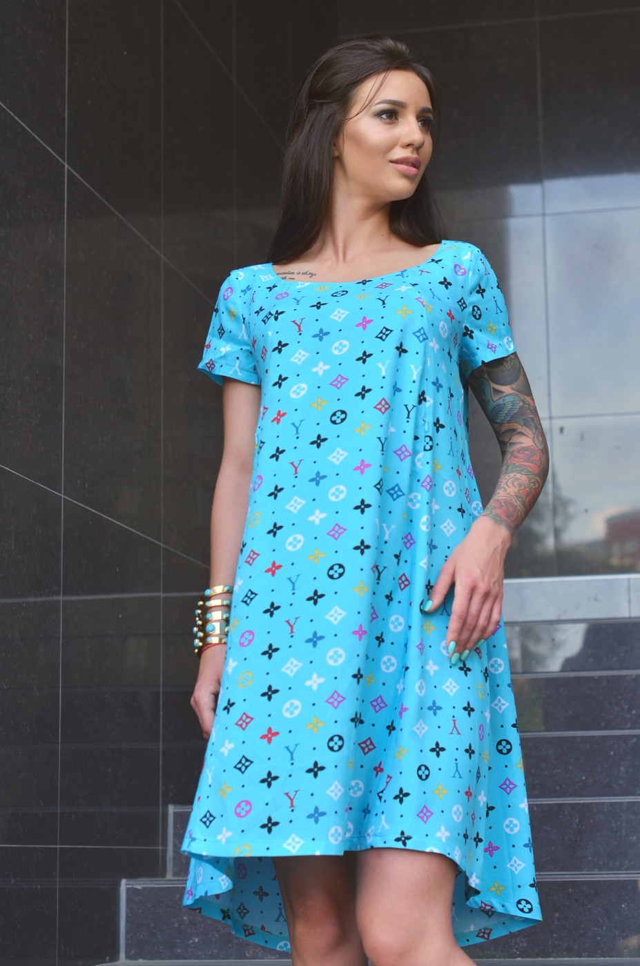 Трендовое асимметричное платье А-образного силуэта из батистовой ткани. Покрой обеспечивает достаточный объем для растущего животика. После родов в этом же платье она может кормить ребенка в людном месте благодаря расположенным потайным молниям в области груди. Удобно для мамы и малыша.