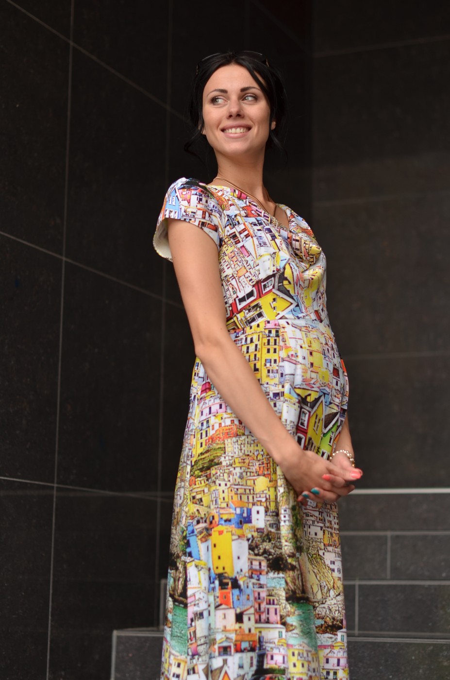 Идеальное платье для знойных дней! Облегающий лиф с глубоким спадающим декольте «водопад» соединяется с длинной струящейся юбкой. Крой «ампир» выгодно подчеркивает женственный силуэт. Сзади лиф слегка стягивается на резиночку, чтобы объем сарафана мог «подрасти» вместе с животиком.