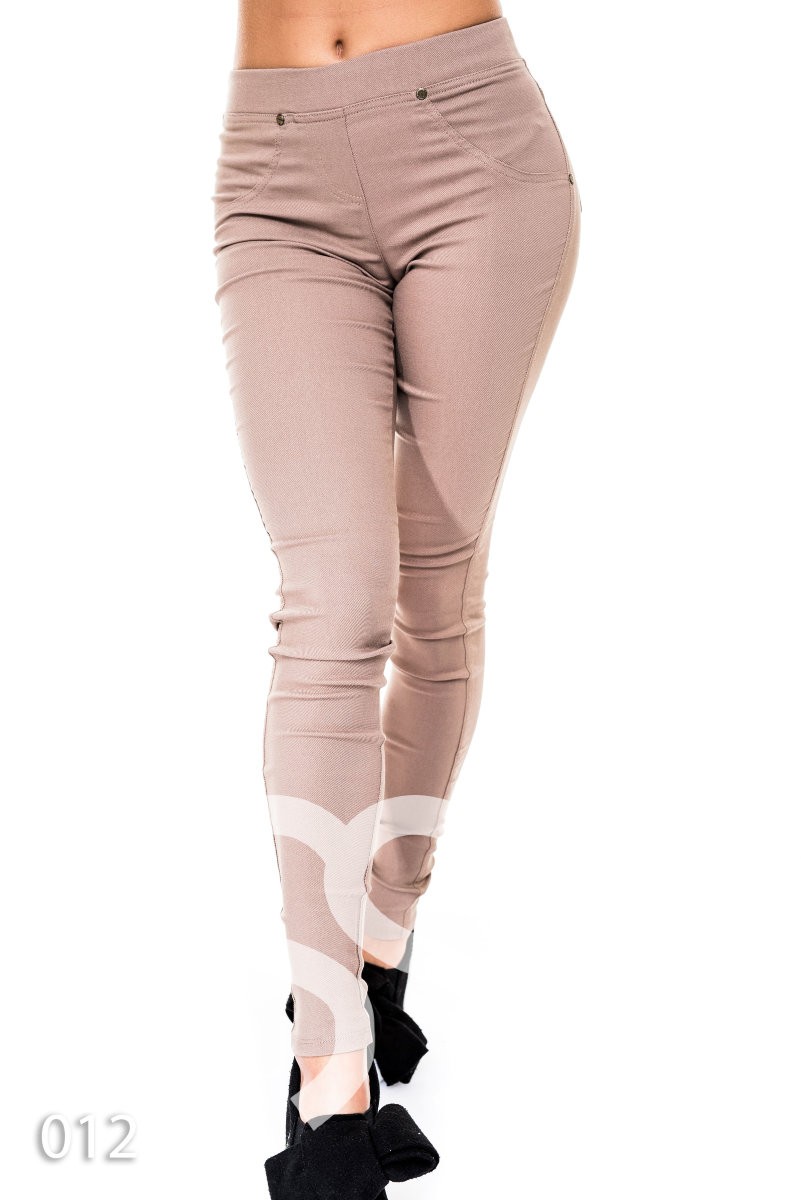 Повседневные джеггинсы светло-коричневого оттенка "кофе с молоком". Модель с металлической фурнитурой, задними кармашками, полностью имитирующая узкие джинсы. Удобная эластичная вещь с широкой резинкой в поясе, которая прекрасно подойдет к любому "верху" из вашего гардероба.