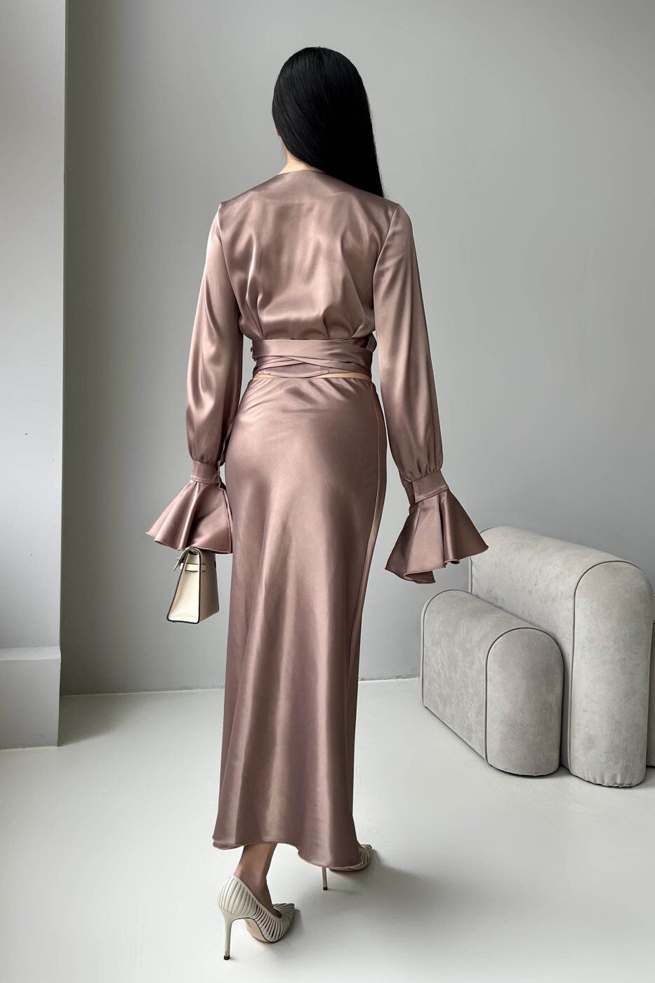 Неперевершено ніжна та жіночна модель костюму зі спідницею з королівського атласу.
