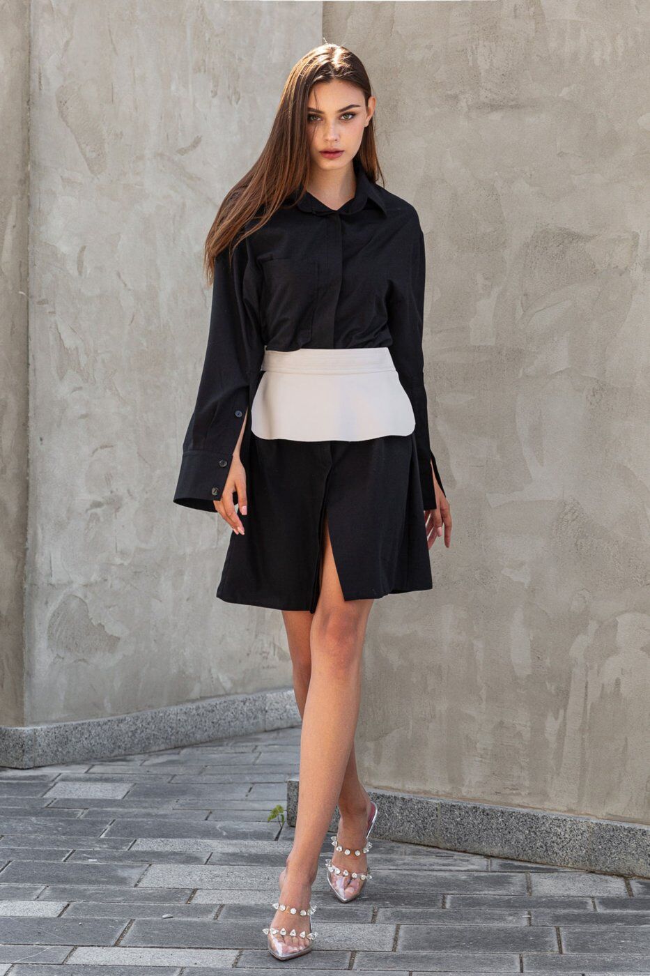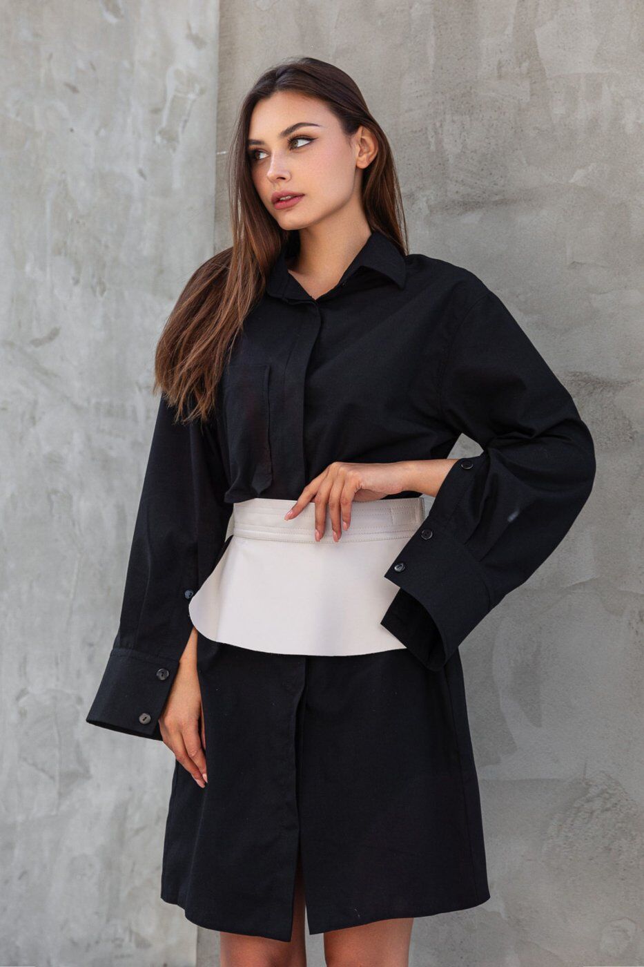 Подовжена сукня-сорочка, виходить в базових чорному та білому кольорах. Модель fashion з відкладним коміром та рядом потаємних ґудзиків по передній частині, а також із широкими манжетами та шліцами на рукавах.