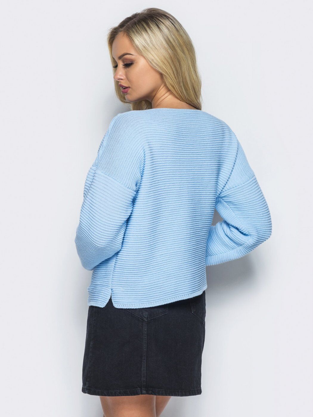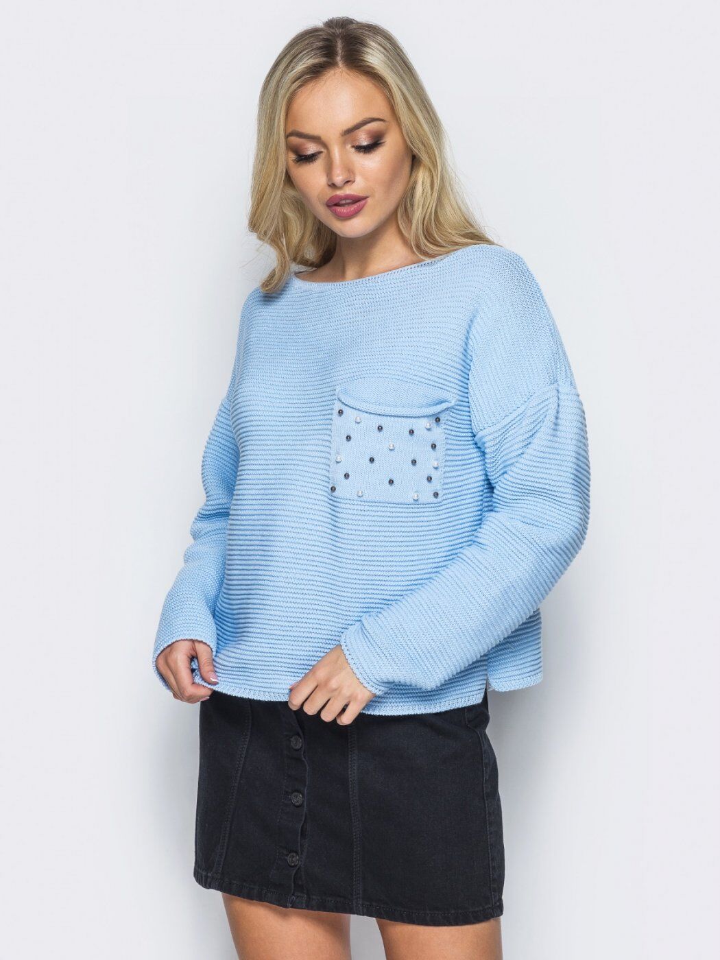 Удобный мягкий свитер со спущенной линией плеча. Полочка изделия дополнена накладным карманом с жемчужной россыпью. Без застежек.