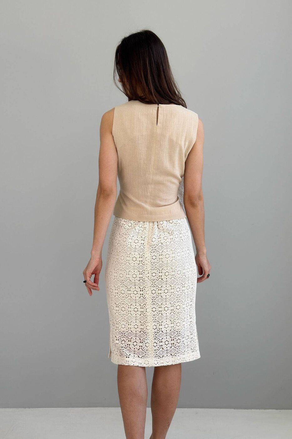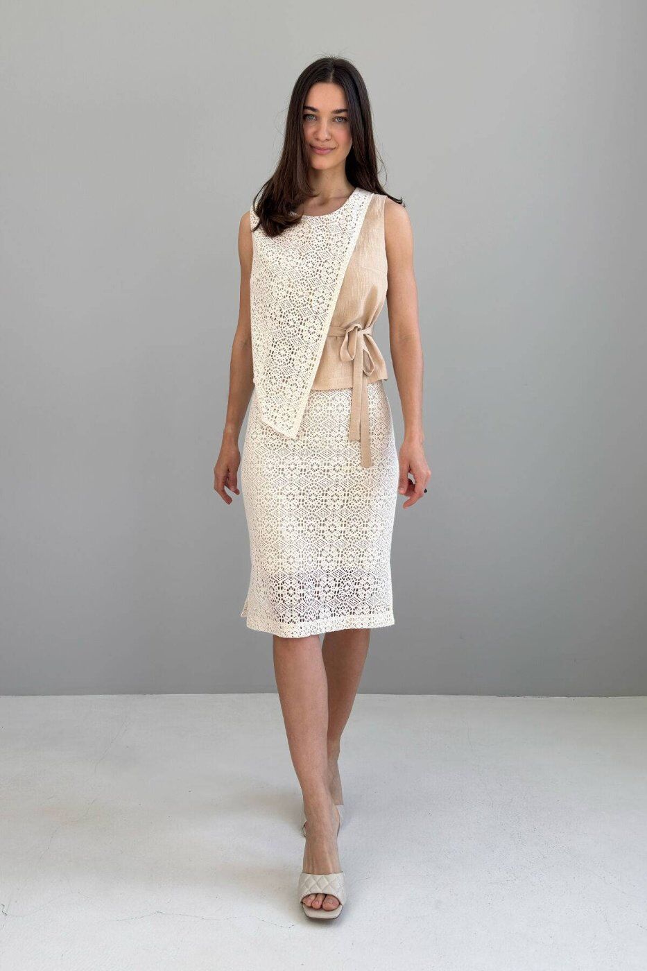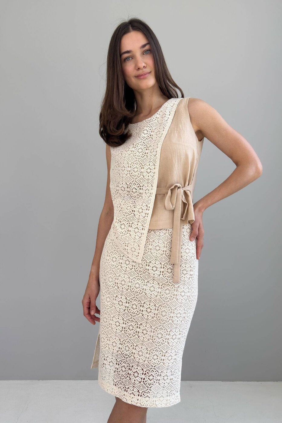 Костюмна тканина лляного переплетіння, бавовняне макраме. Склад костюмної тканини - льон 45%, віскоза 35%, поліестер 20%. Склад макраме - бавовна 100 %