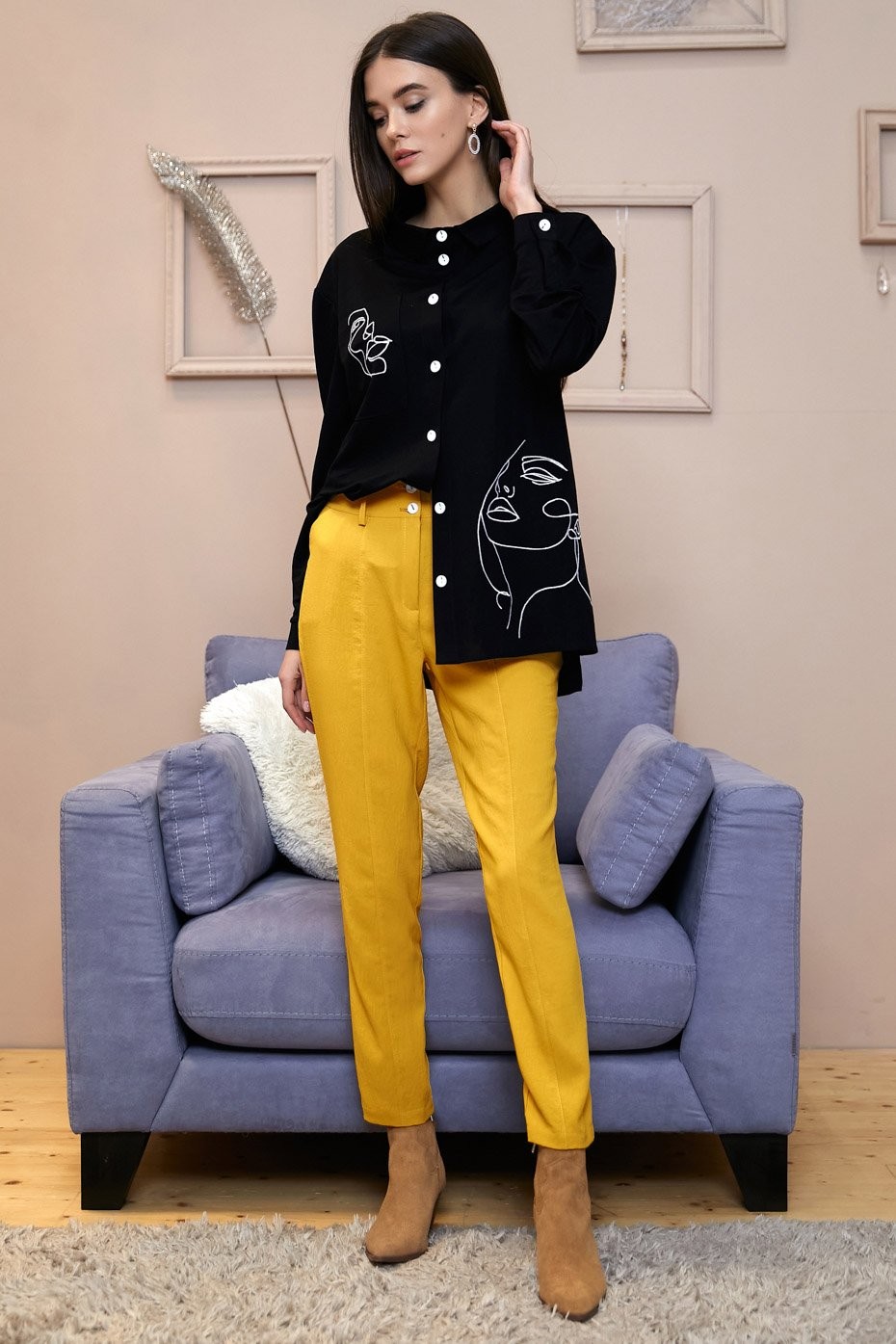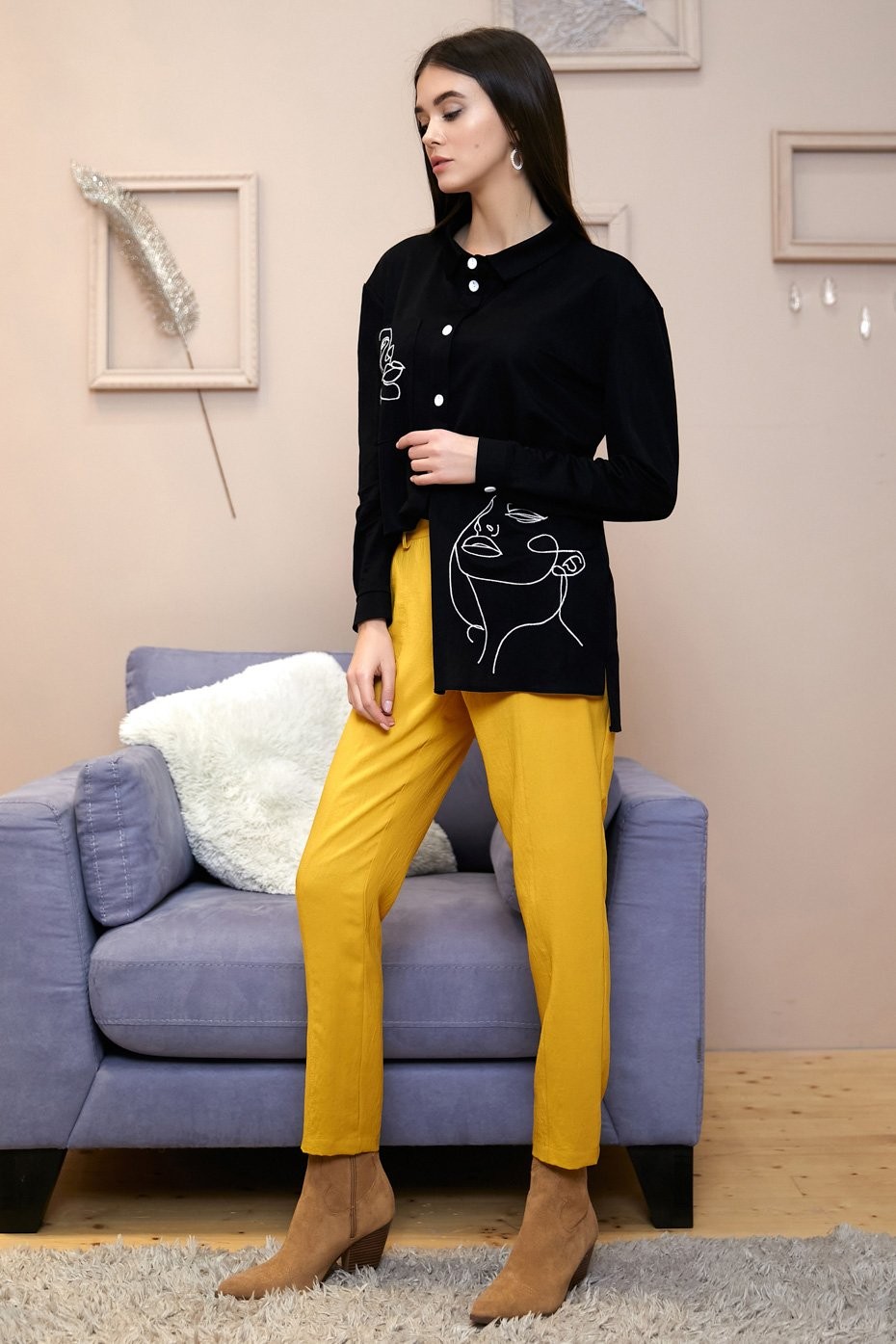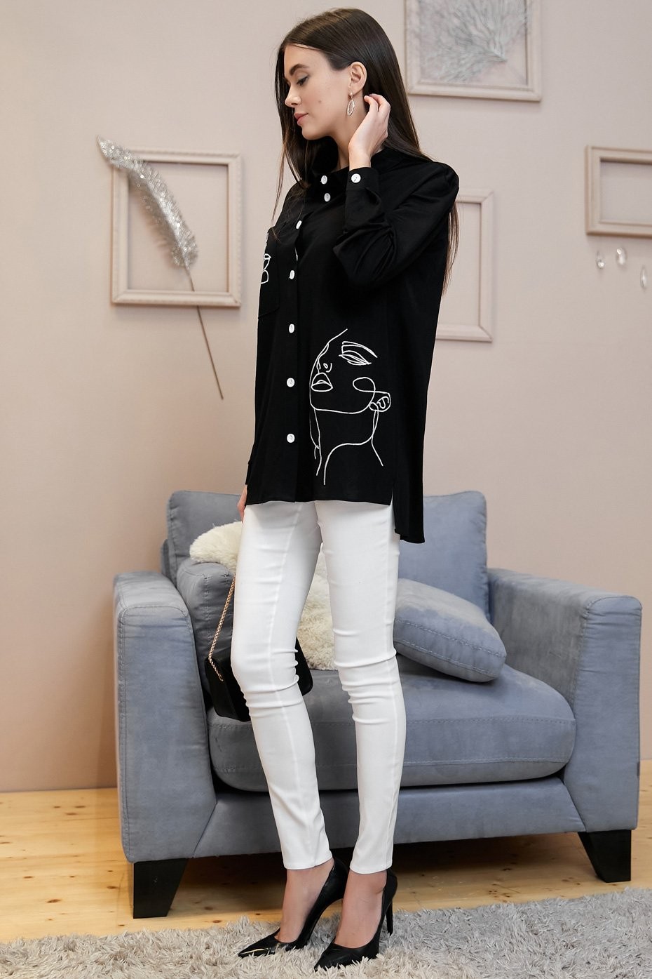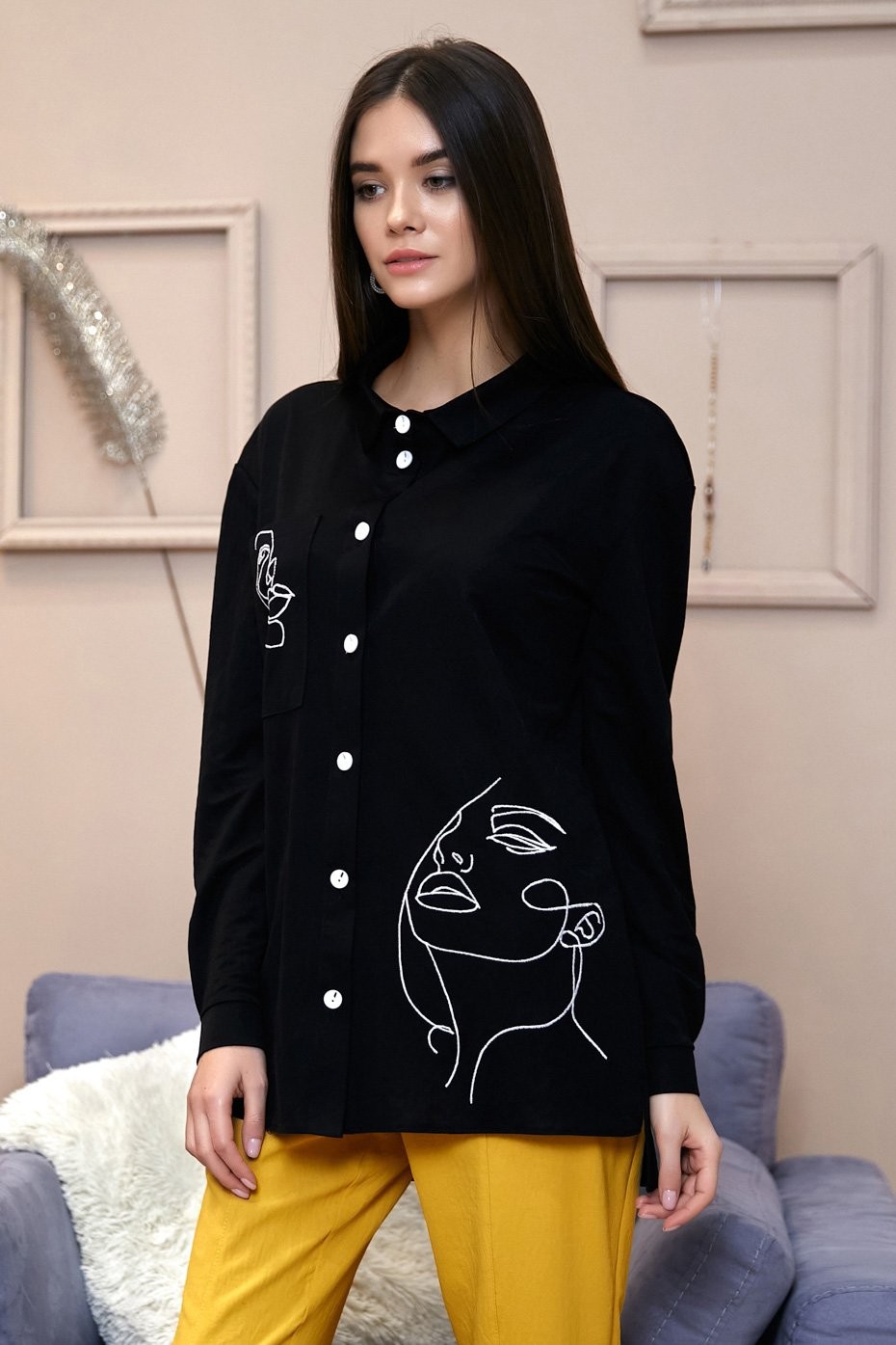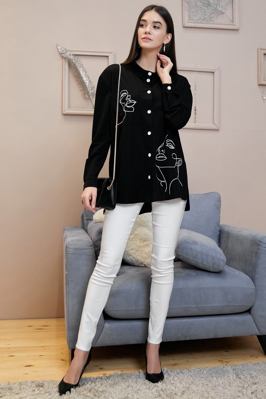 Коллекция Welcome to spring интернет-магазина Seventeen предлагает обратить внимание на удлиненную рубашку черного цвета с асимметричным низом. Модель идеально впишется в повседневный, городской, уличный или классический образ. Рубашка украшена неповторимым принтом белого цвета и контрастными пуговицами. Приспущенные длинные рукава заканчиваются удобными манжетами. На груди расположен накладной карман. Материал креп лакоста, из которого пошита рубашка, удобен в носке и практичен в уходе.Артикул для отображения на сайте: 1327.4008Колекція: Welcome to spring