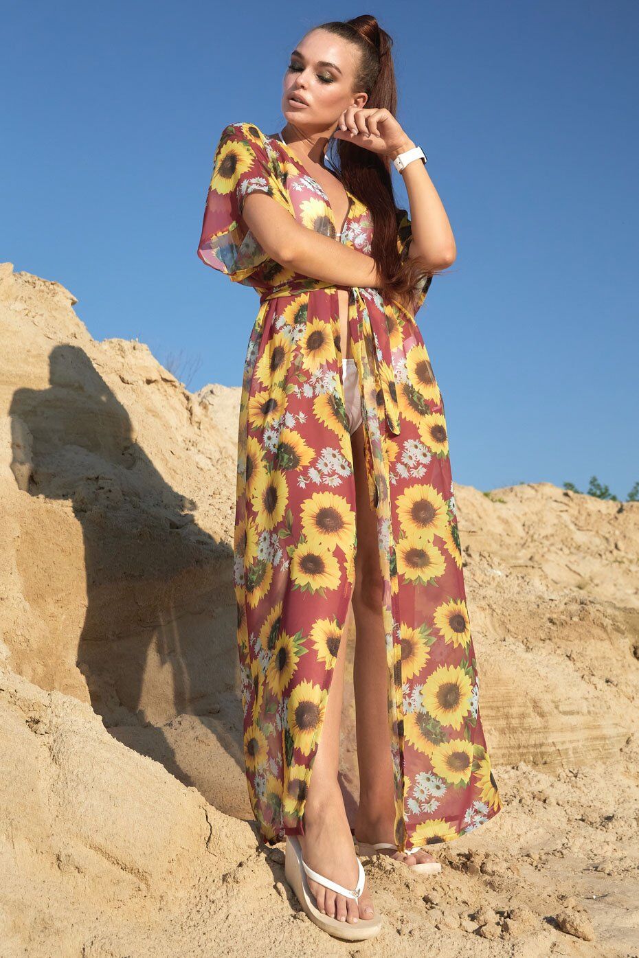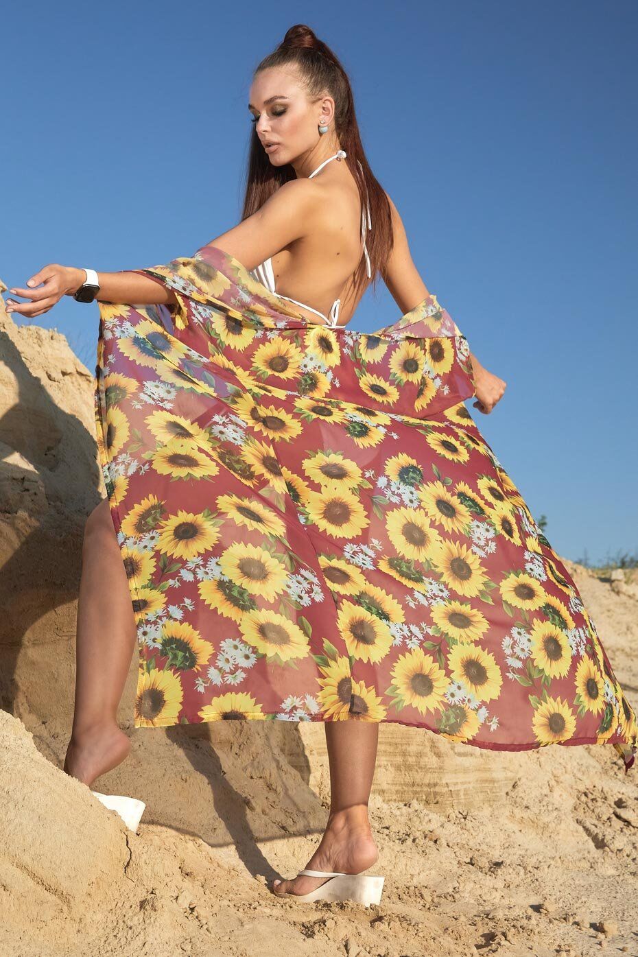 Интернет-магазин Seventeen предлагает украсить свой пляжный образ с помощью эксклюзивной молодежной туники. Она пошита из полупрозрачного высококачественного принтованного шифона с красивым узором из подсолнухов и цветов на марсаловом фоне. Свободный фасон дарит максимальный комфорт. Оригинальность модели подчеркивают короткие цельнокроеные рукава, а талию съемный пояс, идущий в комплекте.Артикул для отображения на сайте: 1602.4201Колекція: Party on the beach