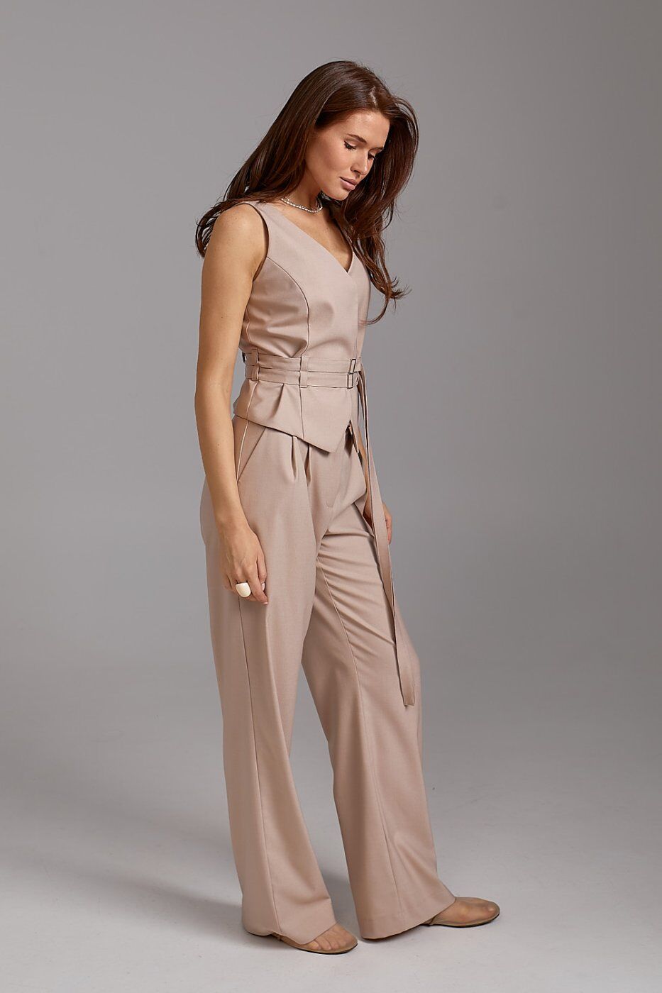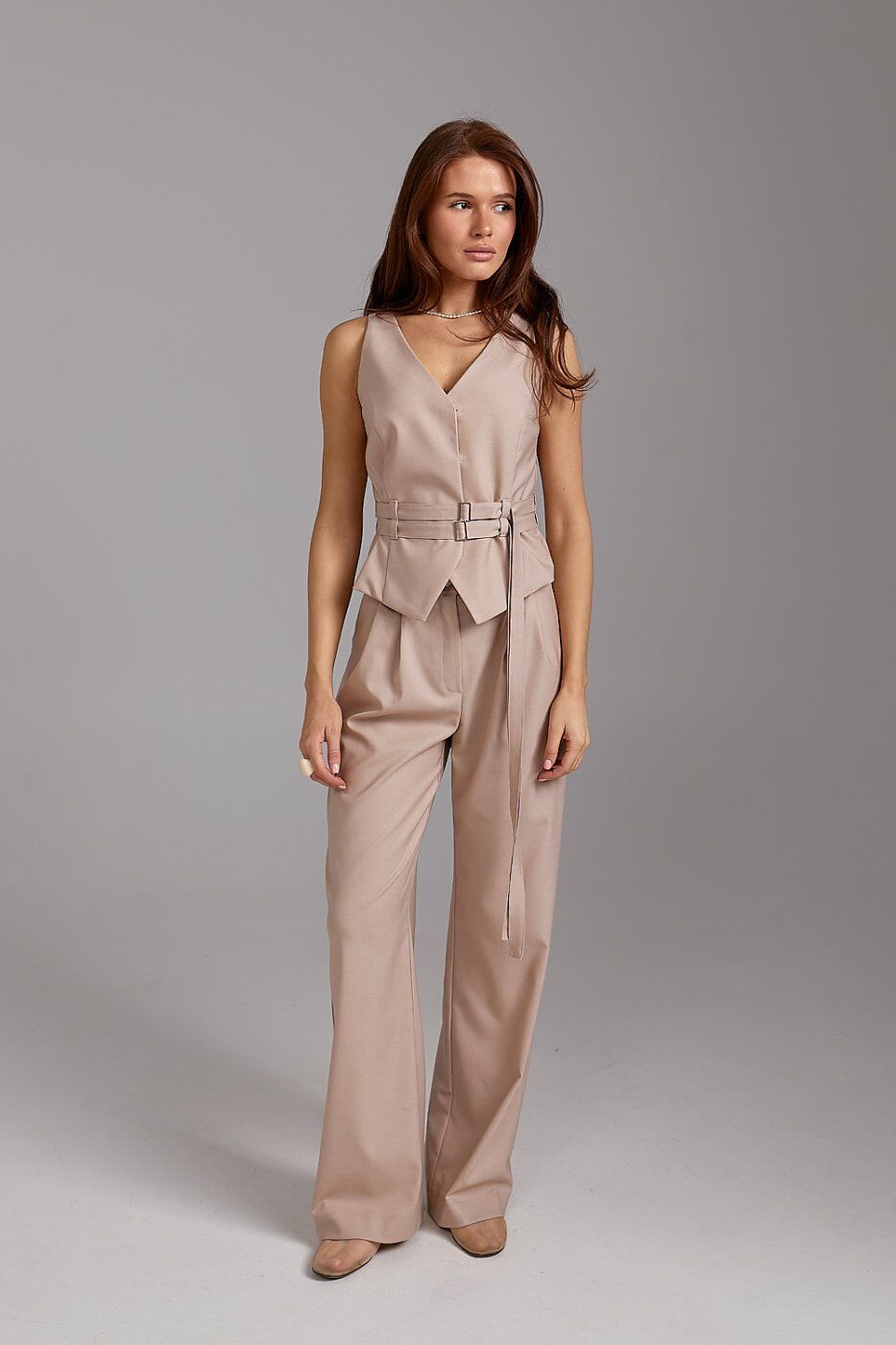 Приталений крій жилета з V-подібним вирізом підкреслює силует. Оригінальний пояс на талії з подвійною пряжкою дозволяє регулювати посадку та створює жіночний акцент.