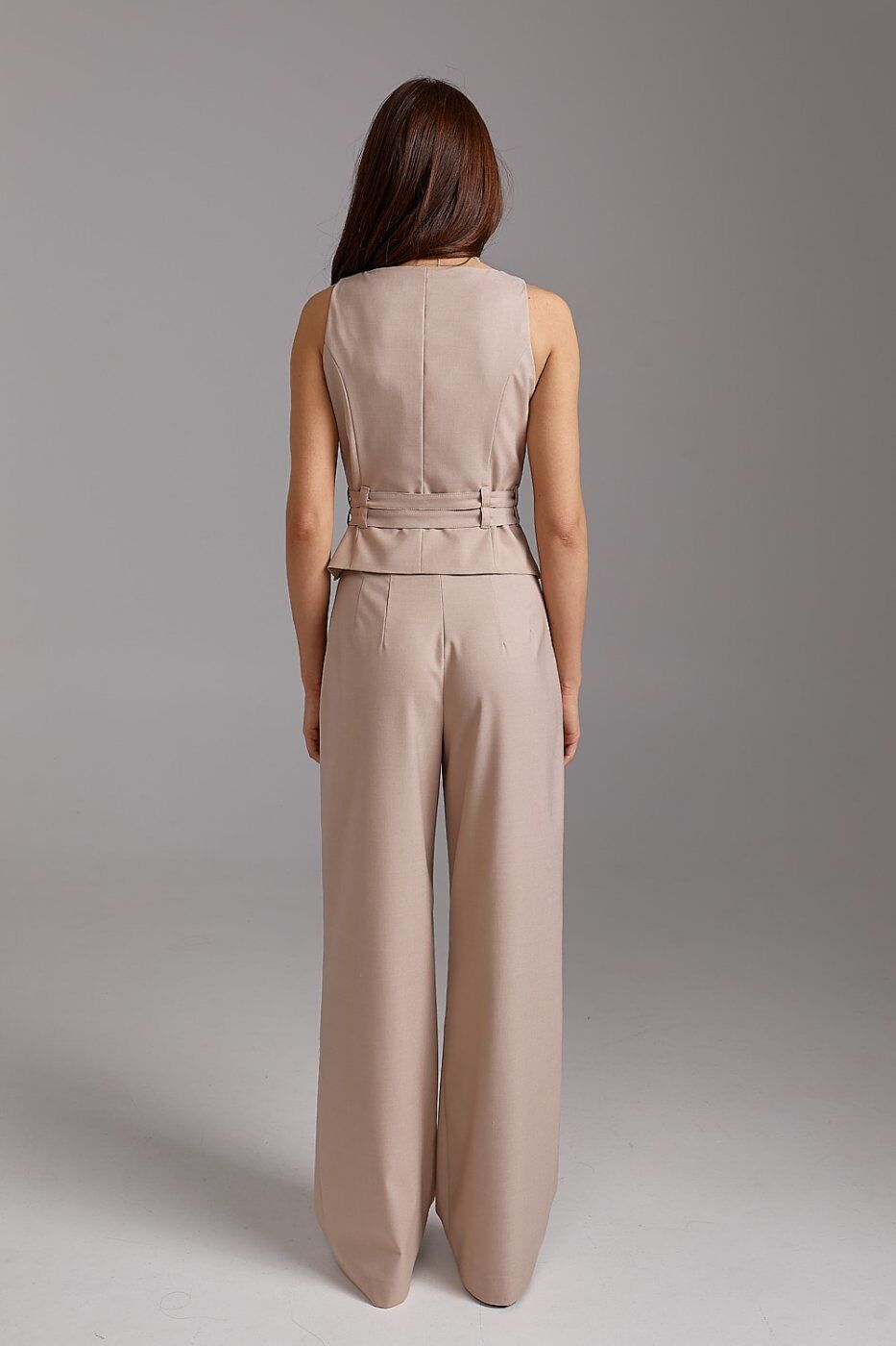 Цей класичний костюм із жилеткою — справжня база для капсульного гардероба. Елементи комплекту можна носити окремо: жилет чудово виглядає з джинсами, а штани-палаццо — з легкими блузами чи топами.
