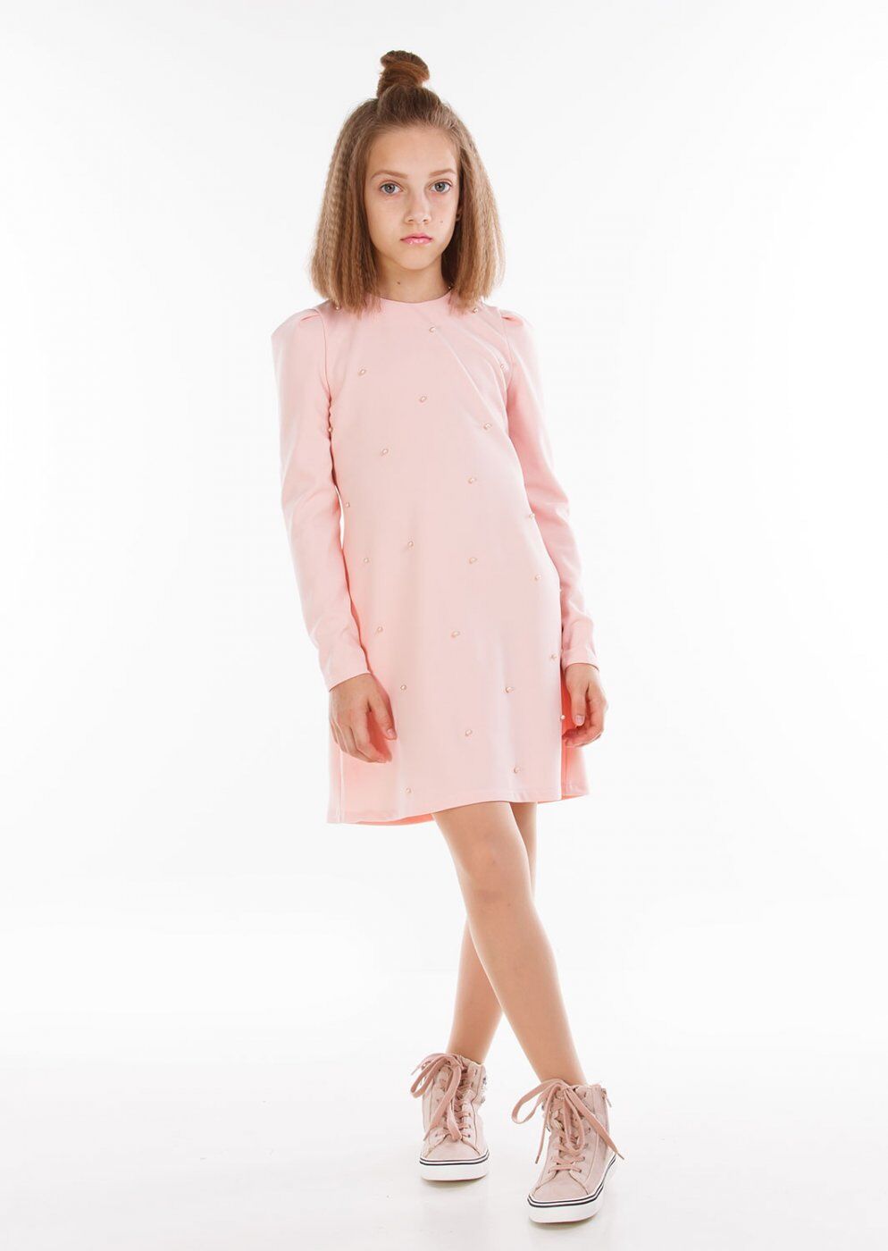 Повседневное платье для девочки, полуприлегающего силуэта, длинной выше линии колена. Рукав длинный, сверху со складами. Застегивается по спинке на потойную молнию. Впереди декорировано бусинами-холиенами.
