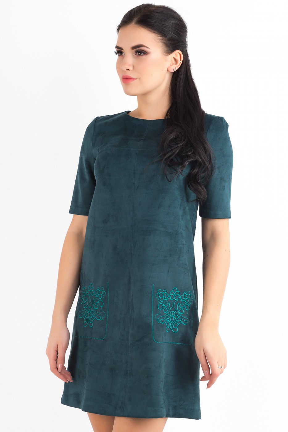 Нарядно-повседневное платье трапециевидного силуэта с вышивкой, имитирующей карманы, с втачным рукавом. По переду центральный вертикальный шов и шов притачивания кокетки, оформленные отделочными строчками.