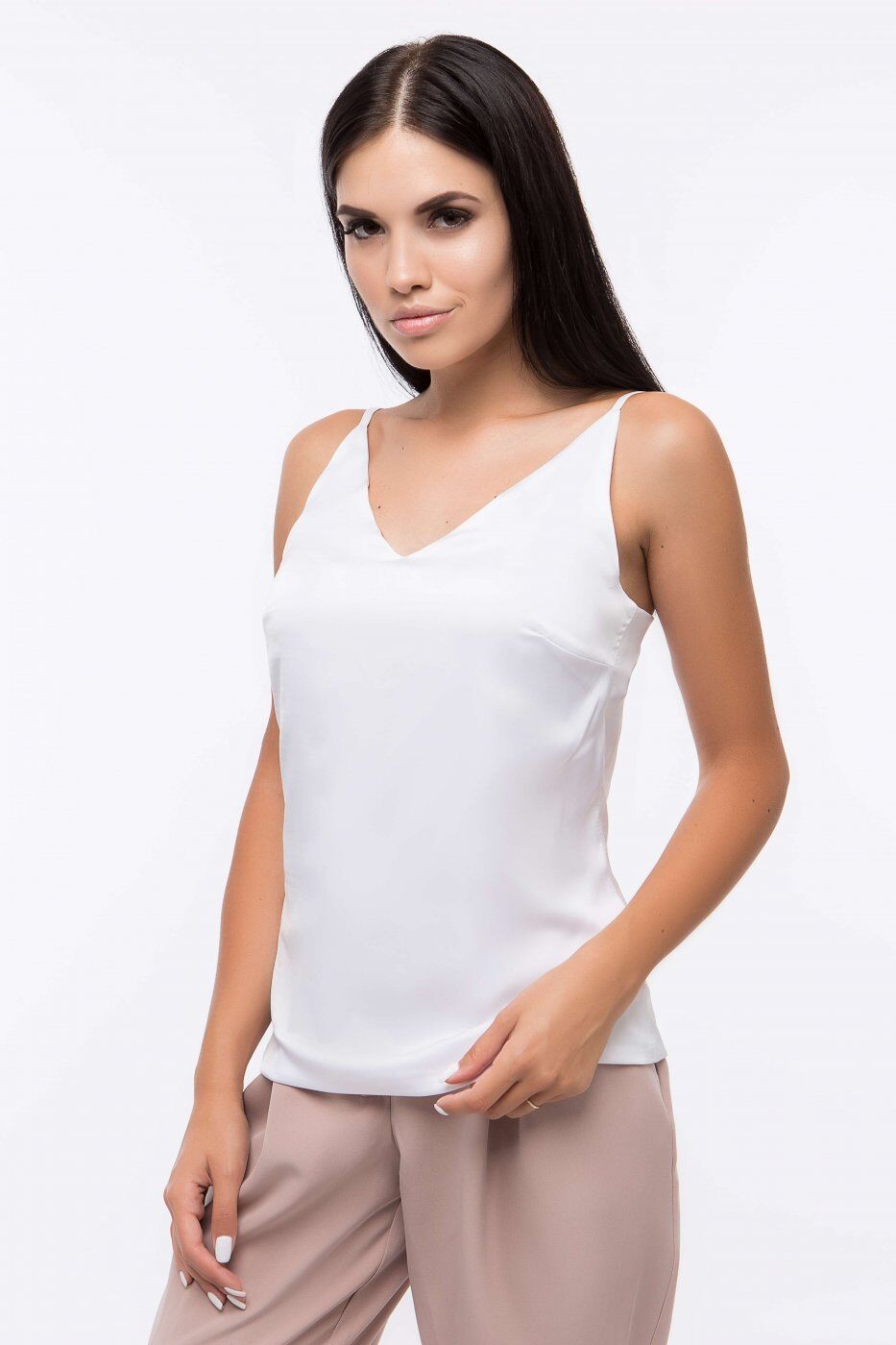 Шелковая майка на бретелях. Длина майки 38см по боковому шву (размер S). Каждый последующий размер длиннее на 1 см. Майка изготовлена на шифоновой подкладке, полностью двойная.