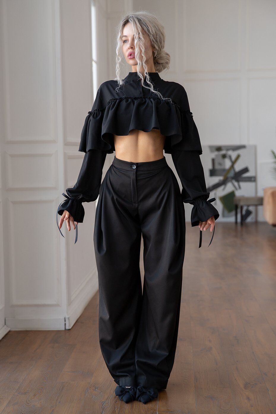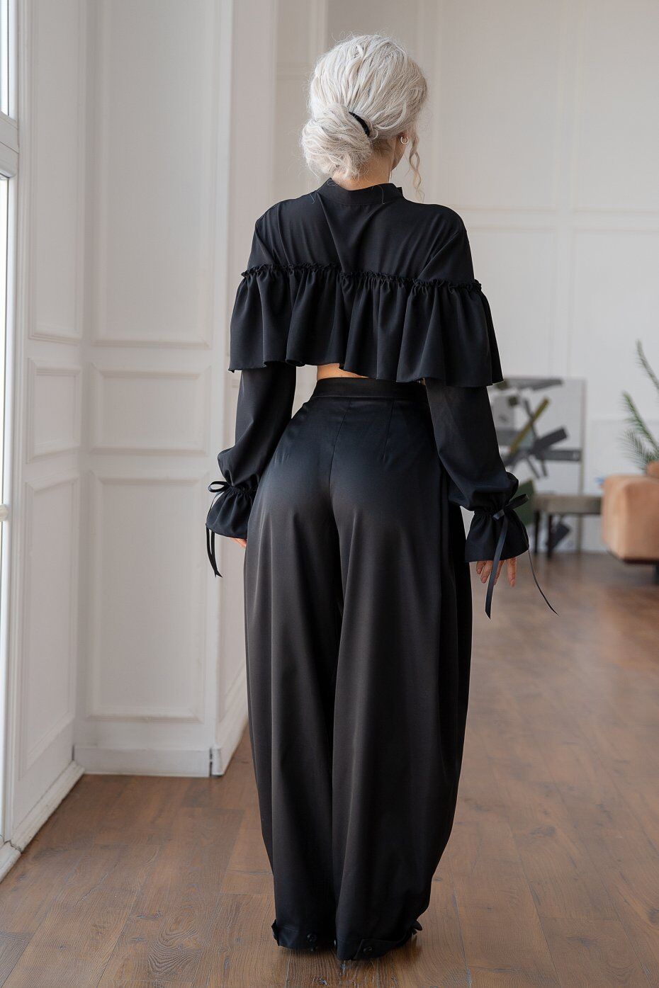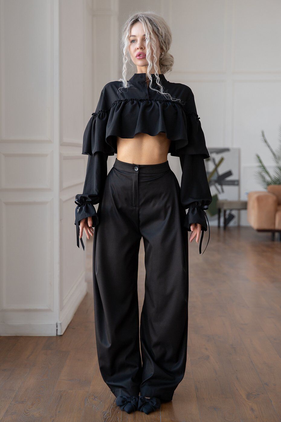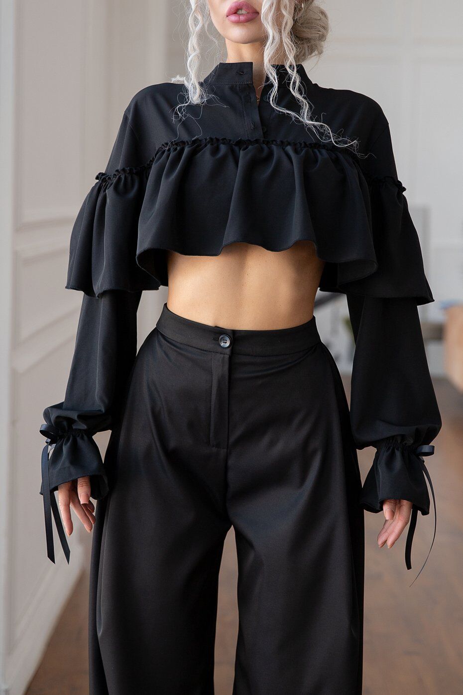 Лёгкая блузка с выразительными воланами — воплощение женственности с характером. Укороченный фасон красиво подчёркивает талию, а воздушные рюши добавляют образу романтичного настроения. Объёмные рукава с завязками создают изящный акцент и делают силуэт особенно эффектным.