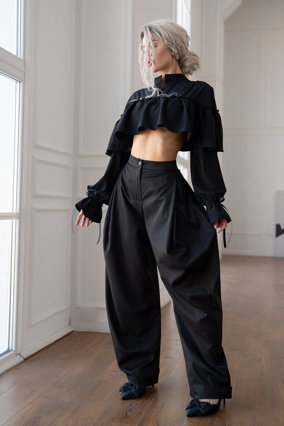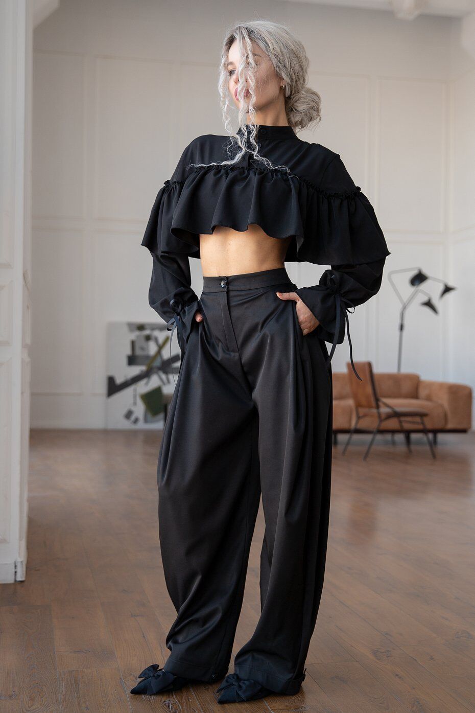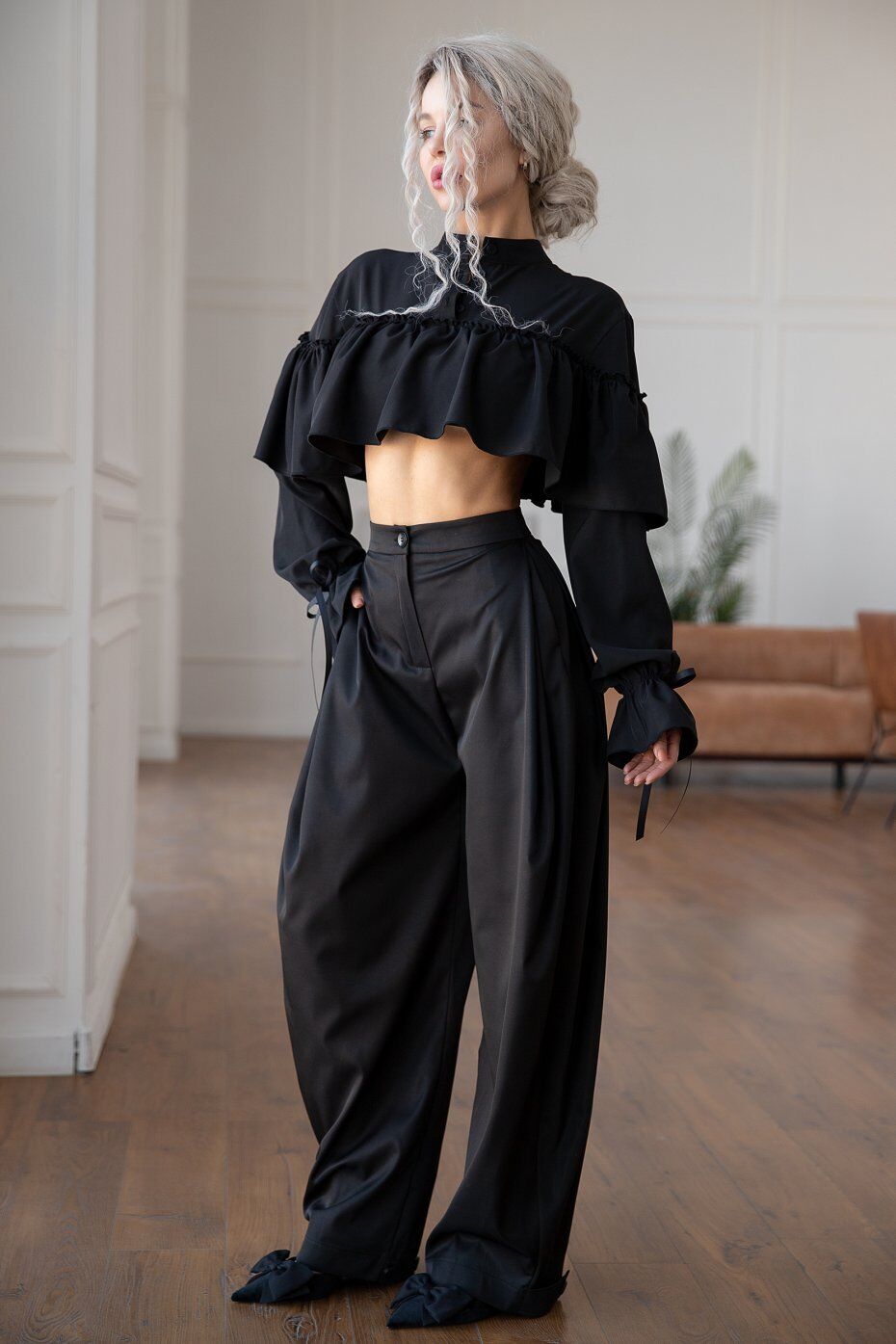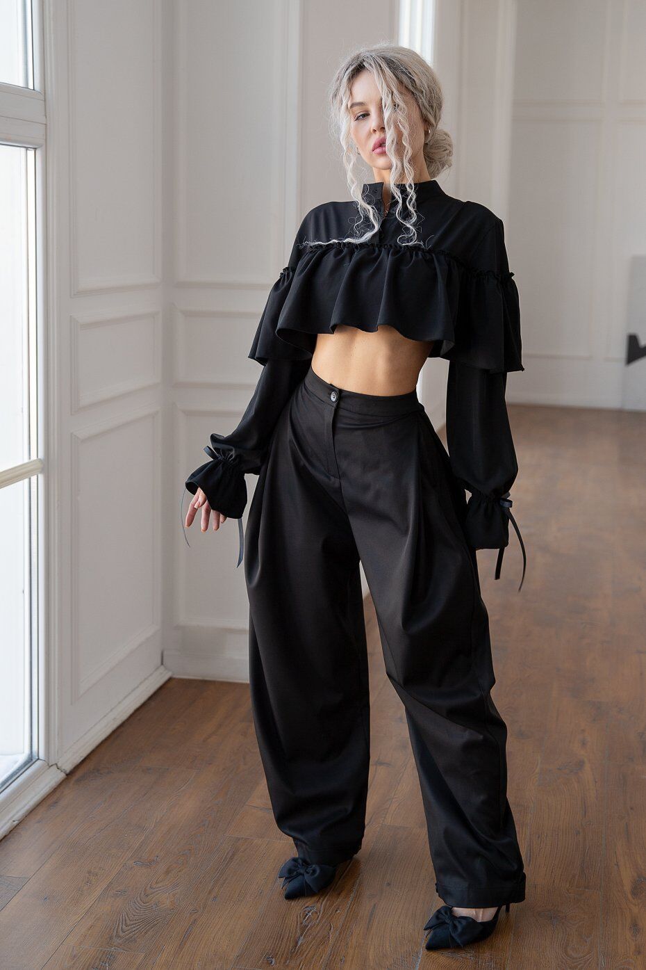 Лёгкая блузка с выразительными воланами — воплощение женственности с характером. Укороченный фасон красиво подчёркивает талию, а воздушные рюши добавляют образу романтичного настроения. Объёмные рукава с завязками создают изящный акцент и делают силуэт особенно эффектным.