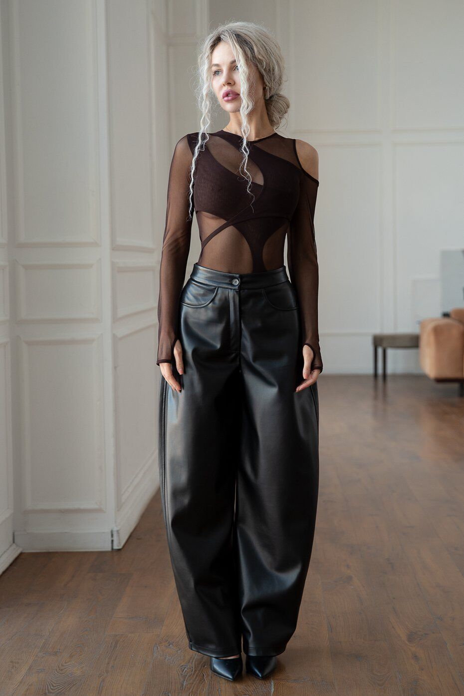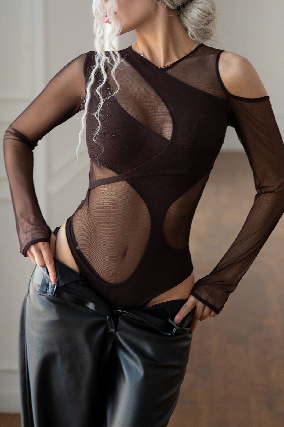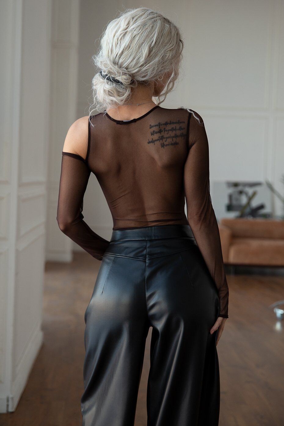 Асимметричное боди выполнено из сетки. На лифе оригинальные переплеты. Один рукав с открытым плечом. По низу рукавов петелька под палец. Длина изделия по боку 34 см. Длина рукава 65 см.