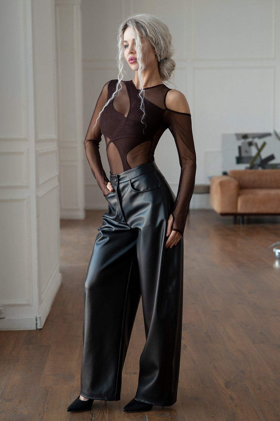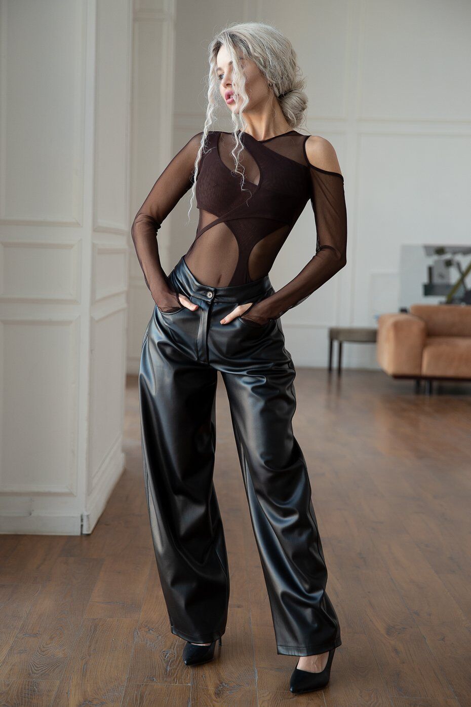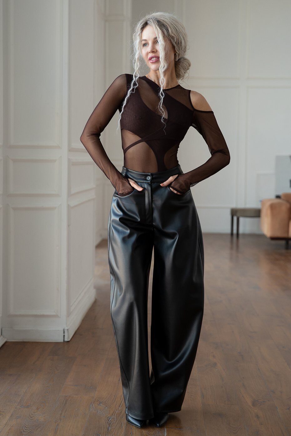 Асимметричное боди выполнено из сетки. На лифе оригинальные переплеты. Один рукав с открытым плечом. По низу рукавов петелька под палец. Длина изделия по боку 34 см. Длина рукава 65 см.