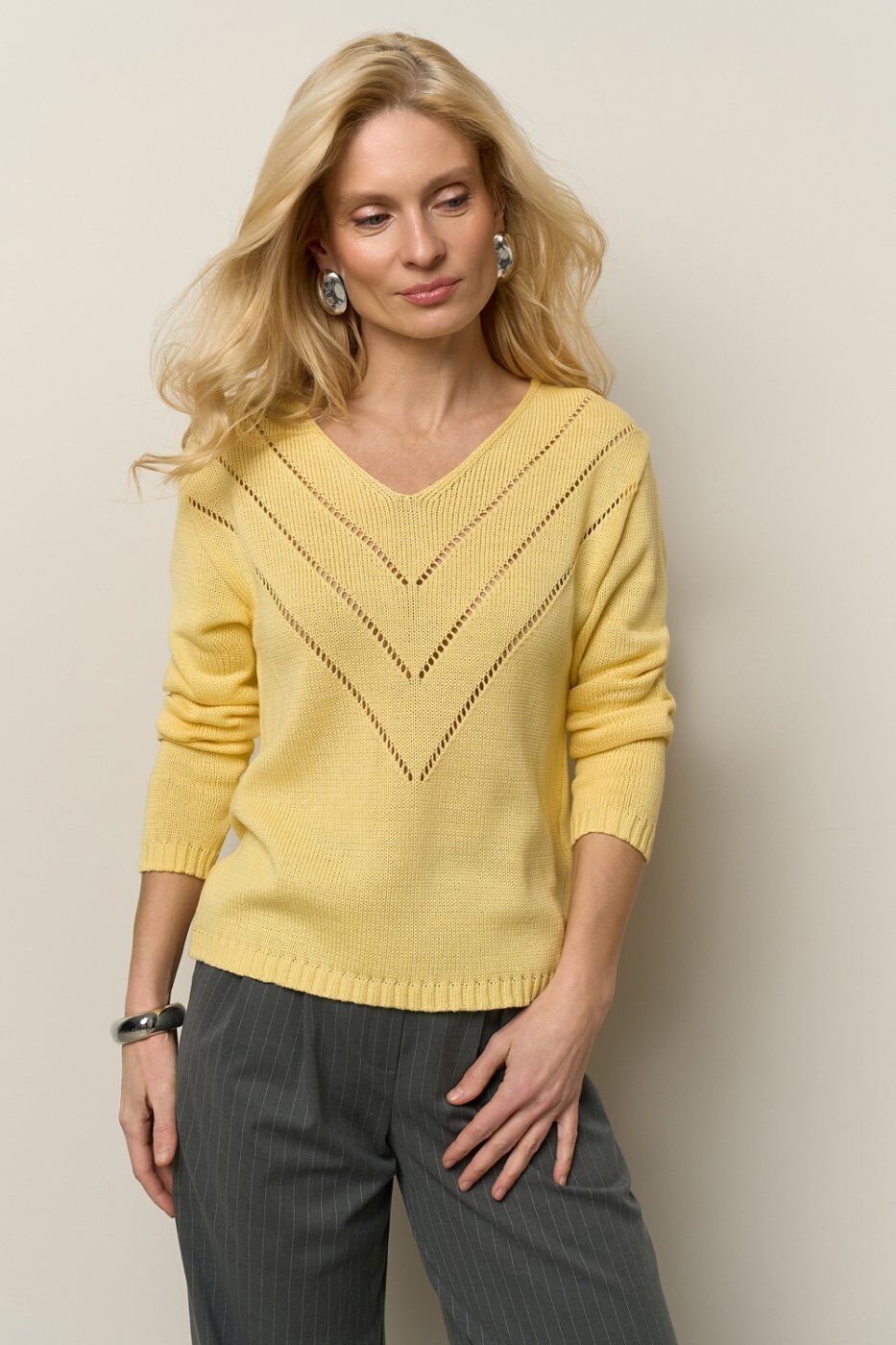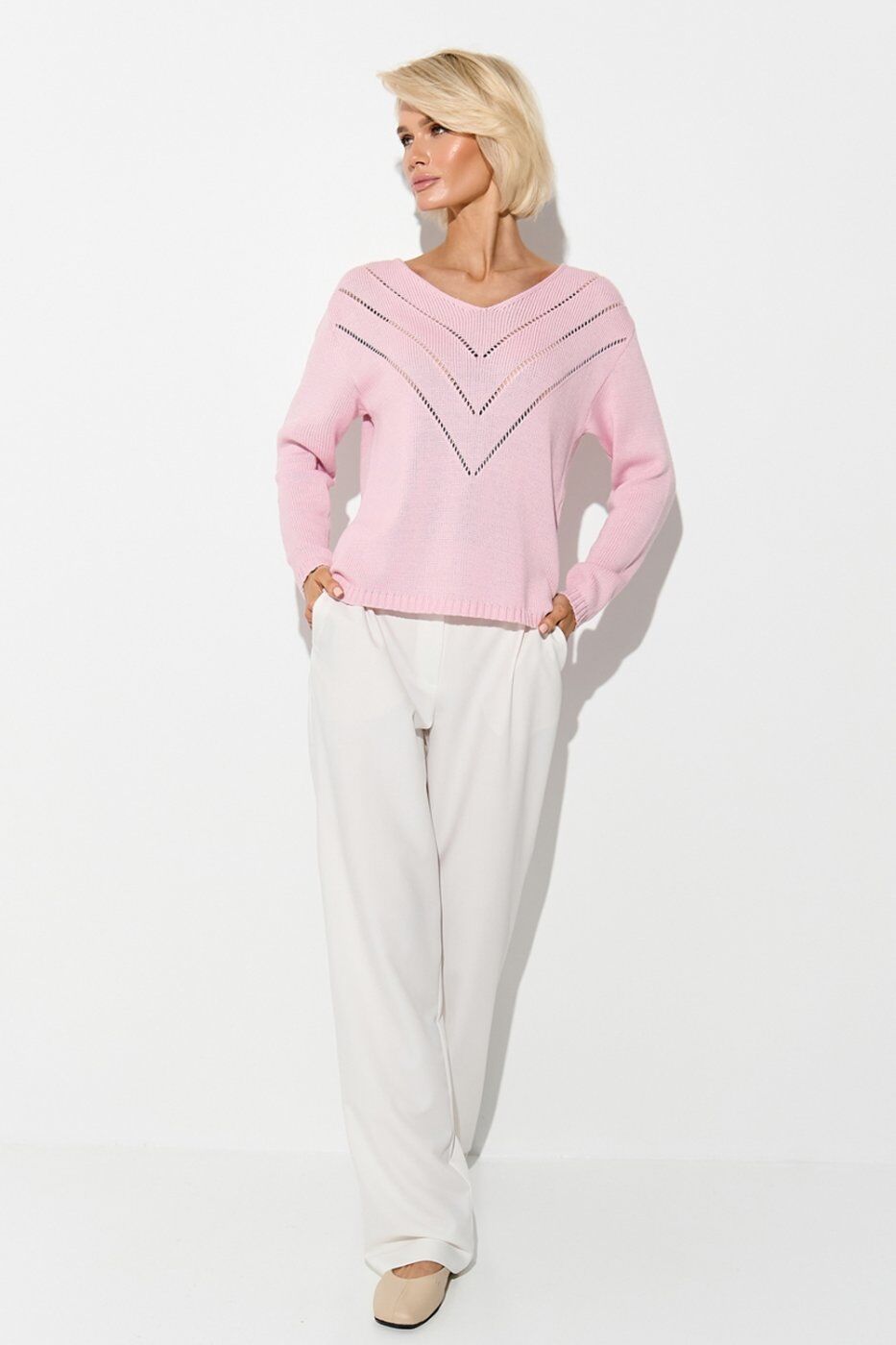 Лаконічний джемпер з акуратним візерунком спереду. Модель виготовлена з бавовняної пряжі з додаванням віскози щільним плетінням. Джемпер вільного силуету зі спущеною лінією плеча.