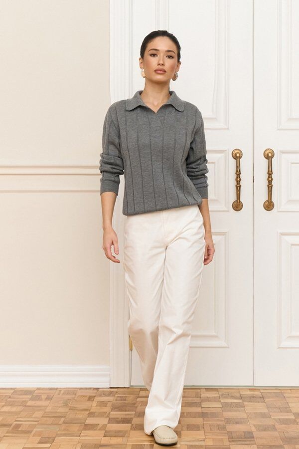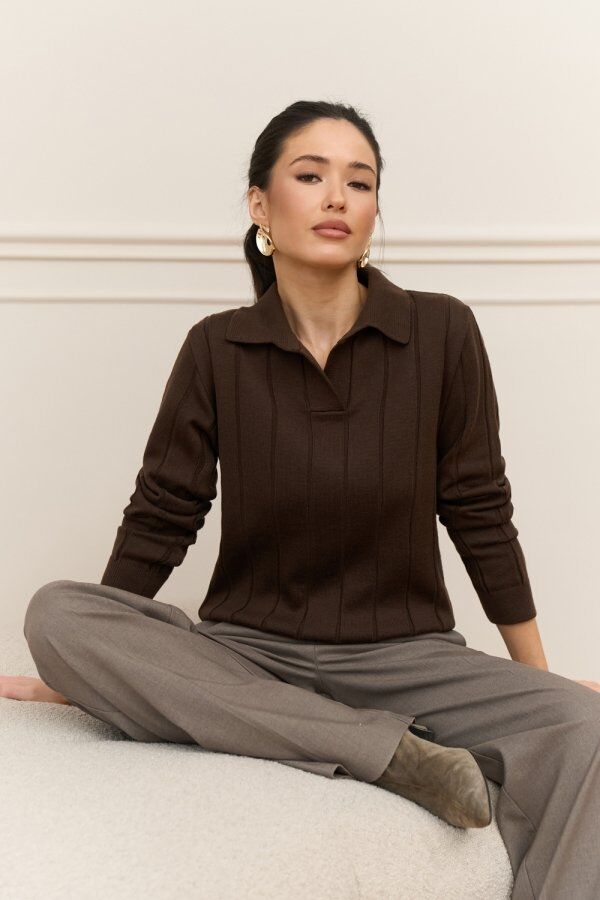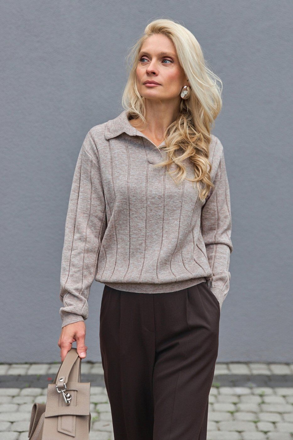 Базове поло виготовлене з вовни мериноса з додаванням кашеміру. Модель виконана стабільною в’язкою середньої щільності та оздоблена візерунком у вертикальну смужку. На рукавах і по низу виробу - еластичні манжети.