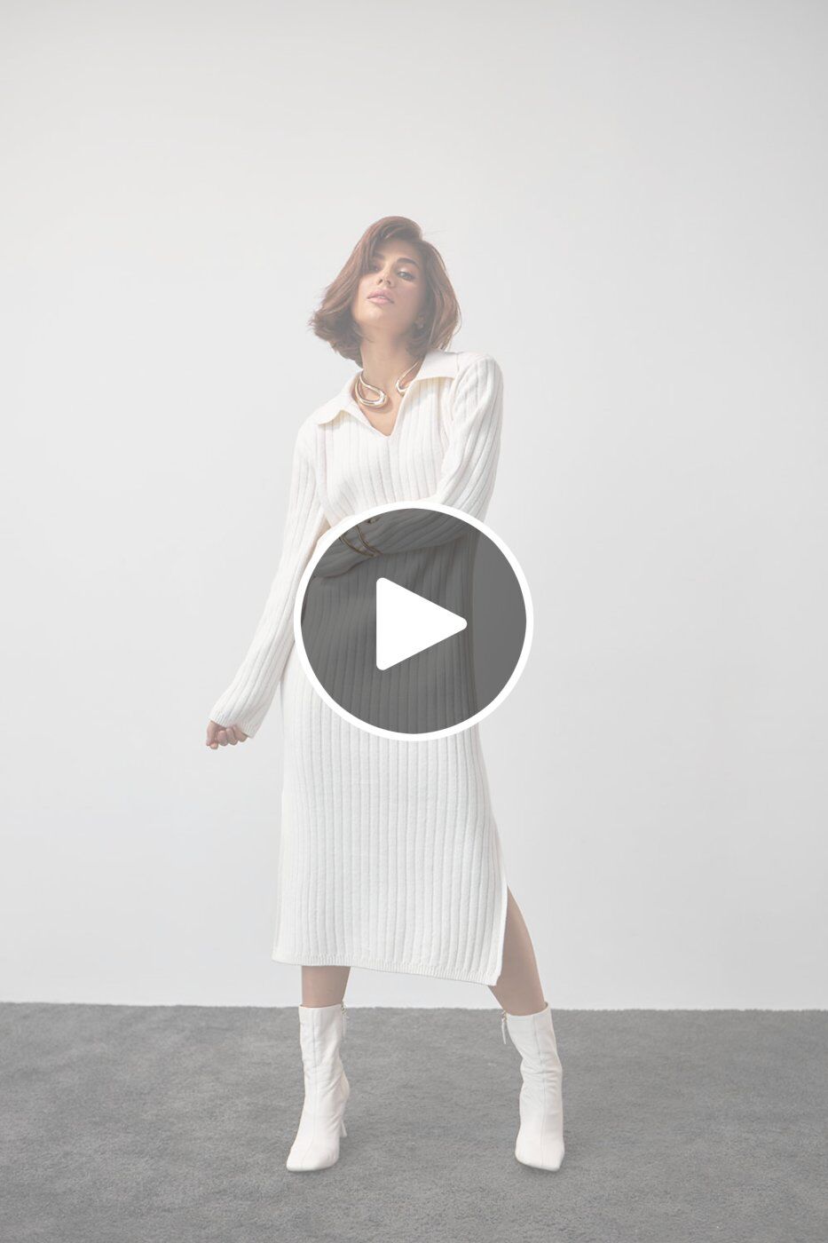 Комфортна в'язана сукня у стабільному переплетенні у вертикальну смужку. Виконана з теплої вовняної пряжі альпака, містить еластан, який чудово тримає форму виробу. Сукня прямого крою довжиною міді з елегантним коміром-поло.
