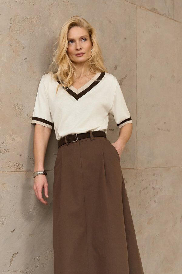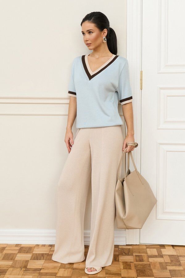 Легкий топ вільного силуету з віскози з додаванням бавовни. V-подібний виріз та манжети рукавів оздоблені контрастними кольорами.