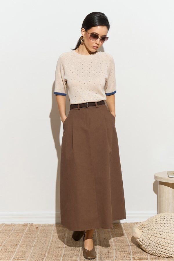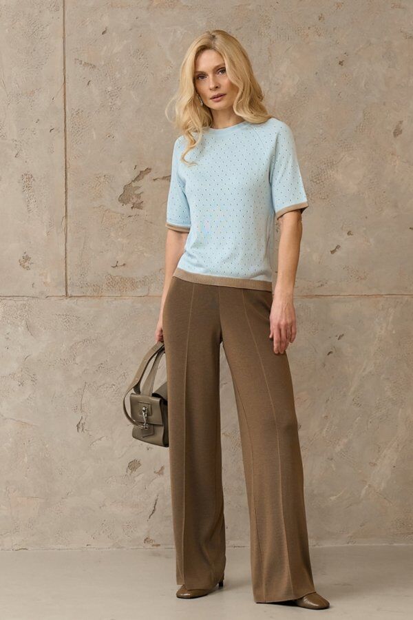 Шовковистий топ із віскозної пряжі. Полотно виробу оздоблене дрібним ажурним візерунком. Горловина, манжети та низ виконані в контрастному кольорі.