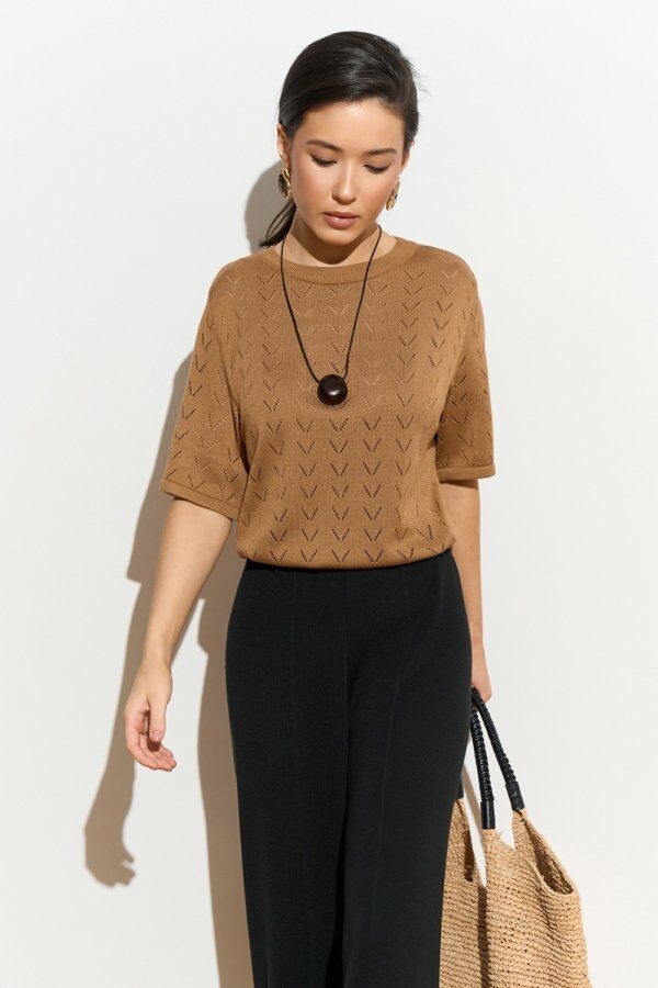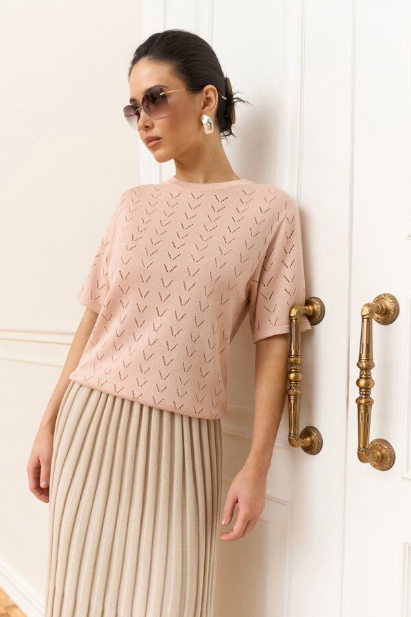 Ніжний топ виготовлений із м'якої, шовковистої віскозної пряжі. Ажурний орнамент по усьому виробу додає витонченості.